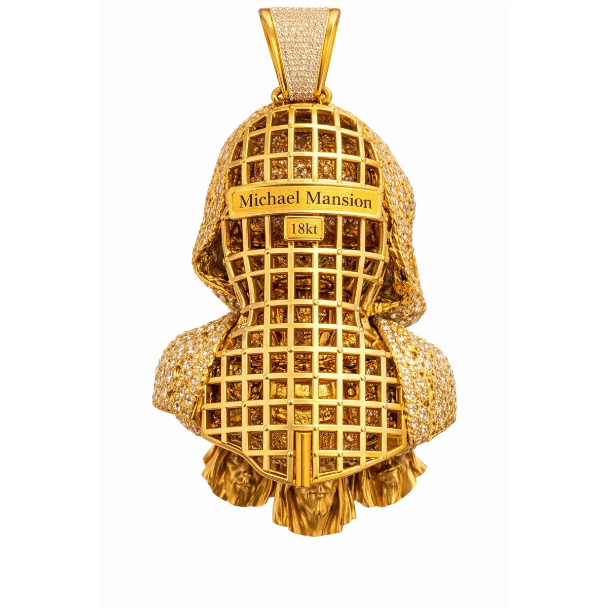 Every detail is executed in true high relief—from the gas mask contours and circular lenses to the hooded drapery, layered textures, and sculpted depth. This is not a flat or stamped pendant; it is a substantial, dimensional work created for collectors and high-level clientele who demand rarity and craftsmanship.