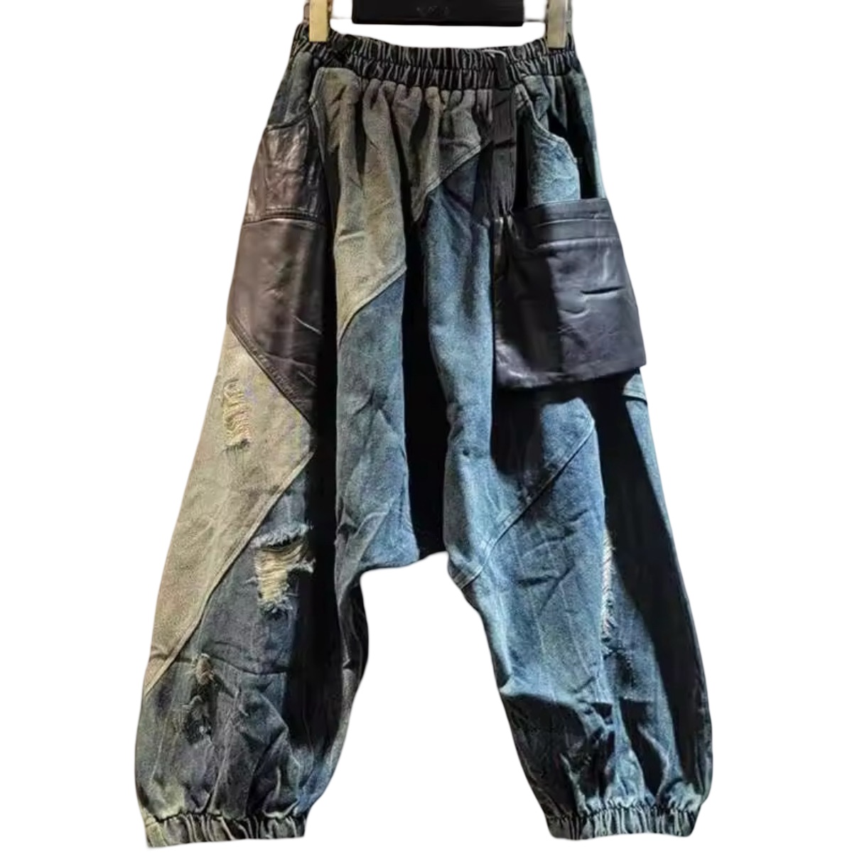The dramatic drop-crotch silhouette delivers a relaxed, architectural drape while maintaining structure through expertly angled seams. Distressed detailing—including raw abrasions, frayed tears, and worn denim overlays—adds an authentic, lived-in character, evoking the feel of reclaimed materials and nomadic utility.