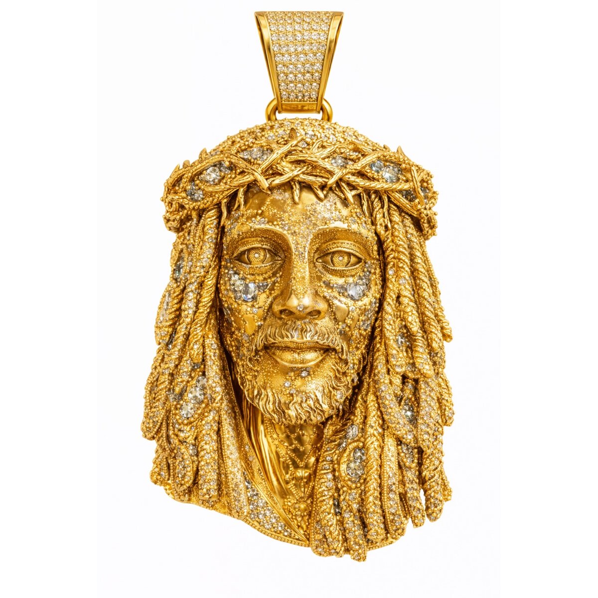 The pendant features a lifelike, high-relief sculpted portrait crowned with an intricately woven thorn-style crown, symbolizing endurance, authority, and spiritual power. Facial features are deeply sculpted and enhanced with micro-pavé VVS diamonds that amplify brilliance while preserving realism.