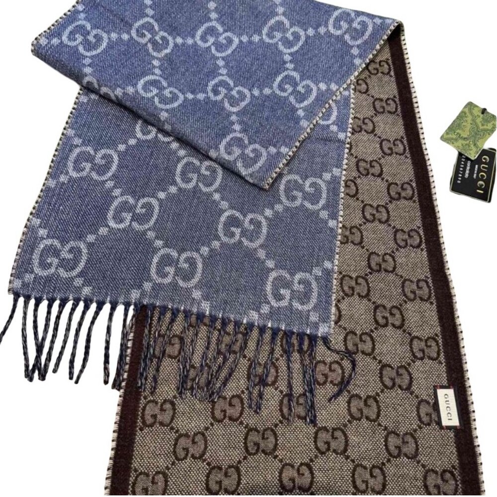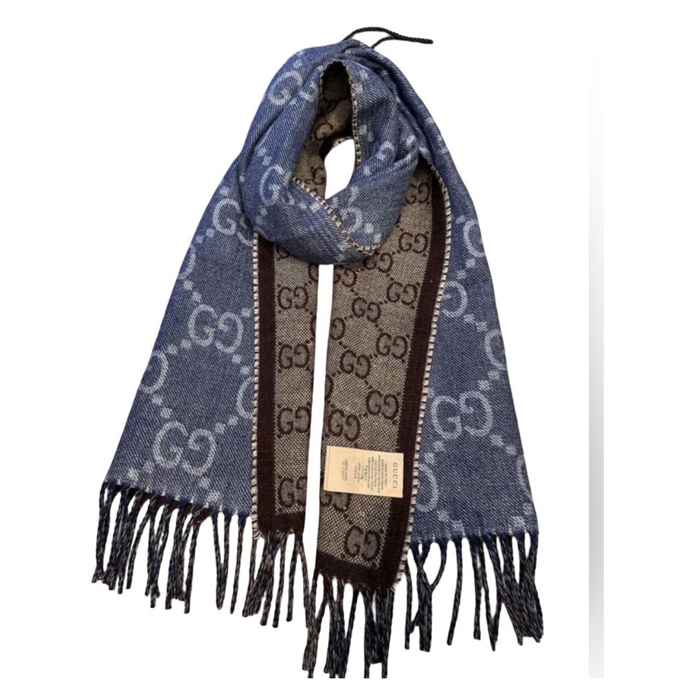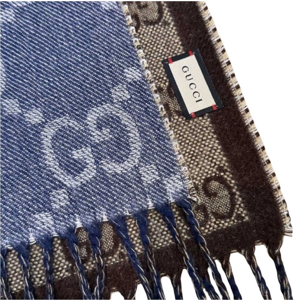 Part of the House’s codes first presented during the ‘30s, the distinctive GG motif has been the inspiration for new explorations of expression for almost a century. Here it's presented in an exaggerated version on this wool scarf.