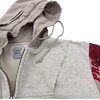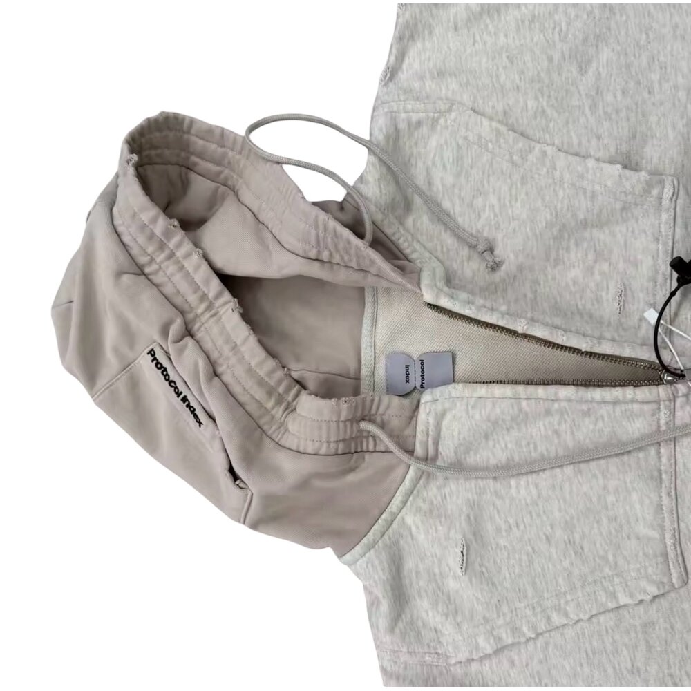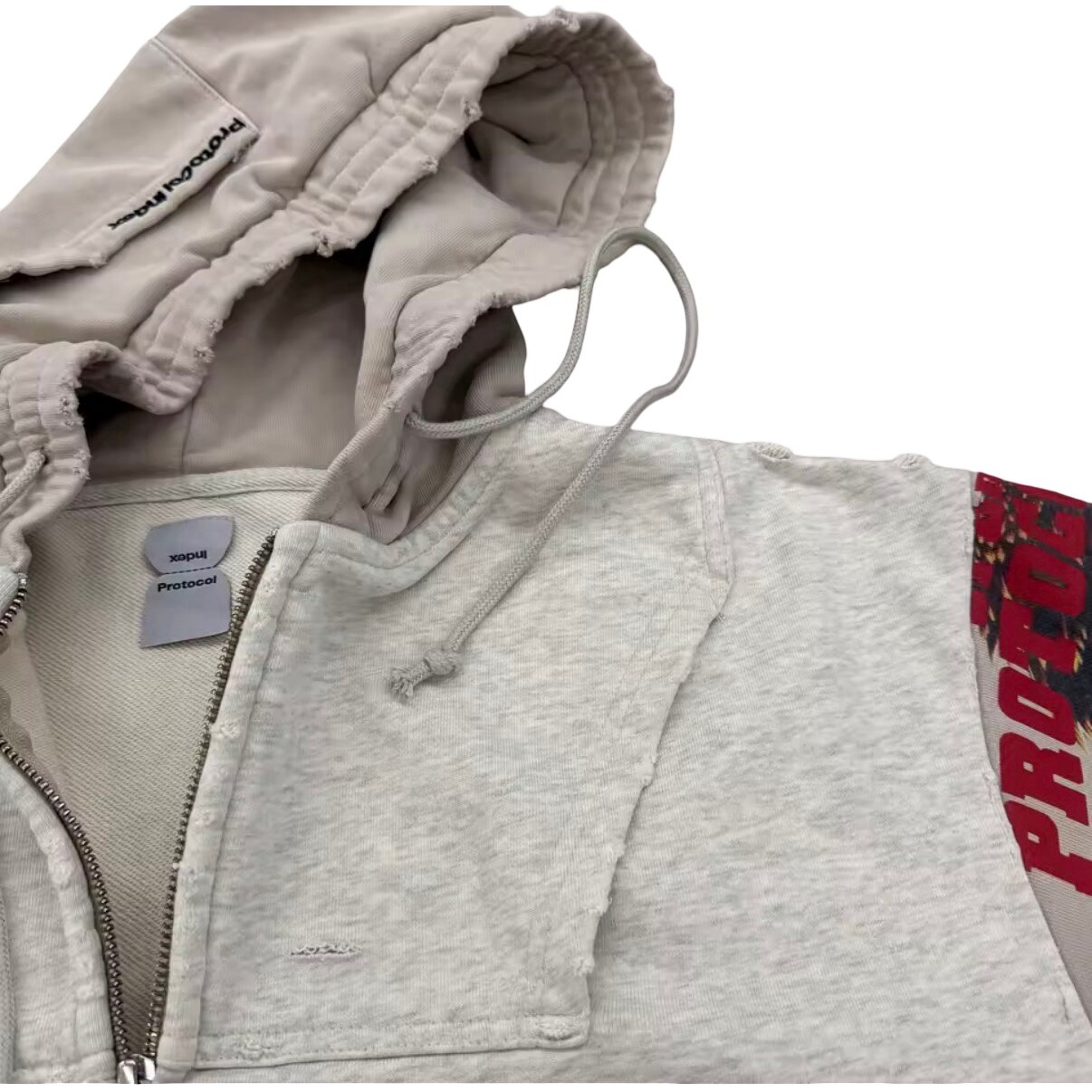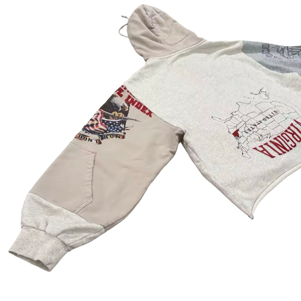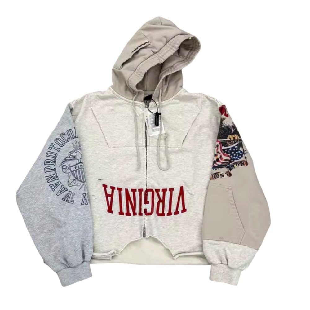 Key Features: • Premium cotton-blend fleece with soft interior lining • Cropped silhouette with raw-edge hem detailing • Full-length metal zipper front closure • Oversized reversed collegiate typography graphic • Asymmetric patchwork sleeves in grey and beige tones • Multi-color printed sleeve artwork and crest-style emblem graphics • Double-layer hood with adjustable drawstrings • Ribbed cuffs for comfort and structure • Relaxed oversized fit ideal for layered streetwear styling • Unisex contemporary fashion appeal