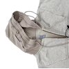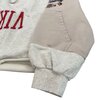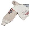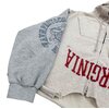 Patchwork construction is a defining element of this piece. The left sleeve presents a soft grey fleece panel featuring emblem-inspired graphics reminiscent of traditional academic crests, while the right sleeve shifts into a neutral beige tone highlighted by bold multi-color printed artwork that introduces contrast and narrative depth. This deliberate asymmetry creates visual energy and emphasizes the garment’s handcrafted, remix-style identity.