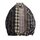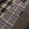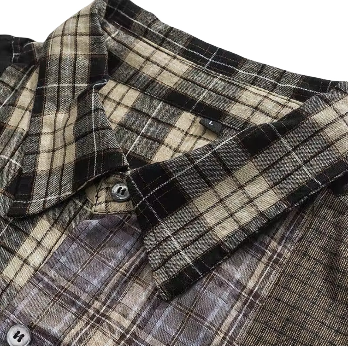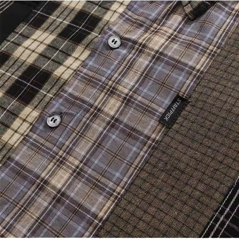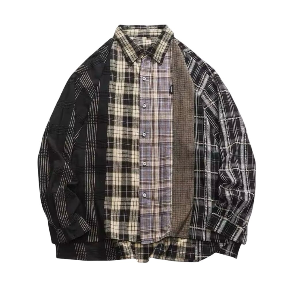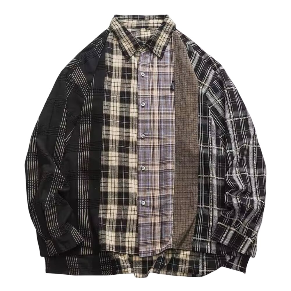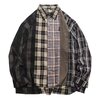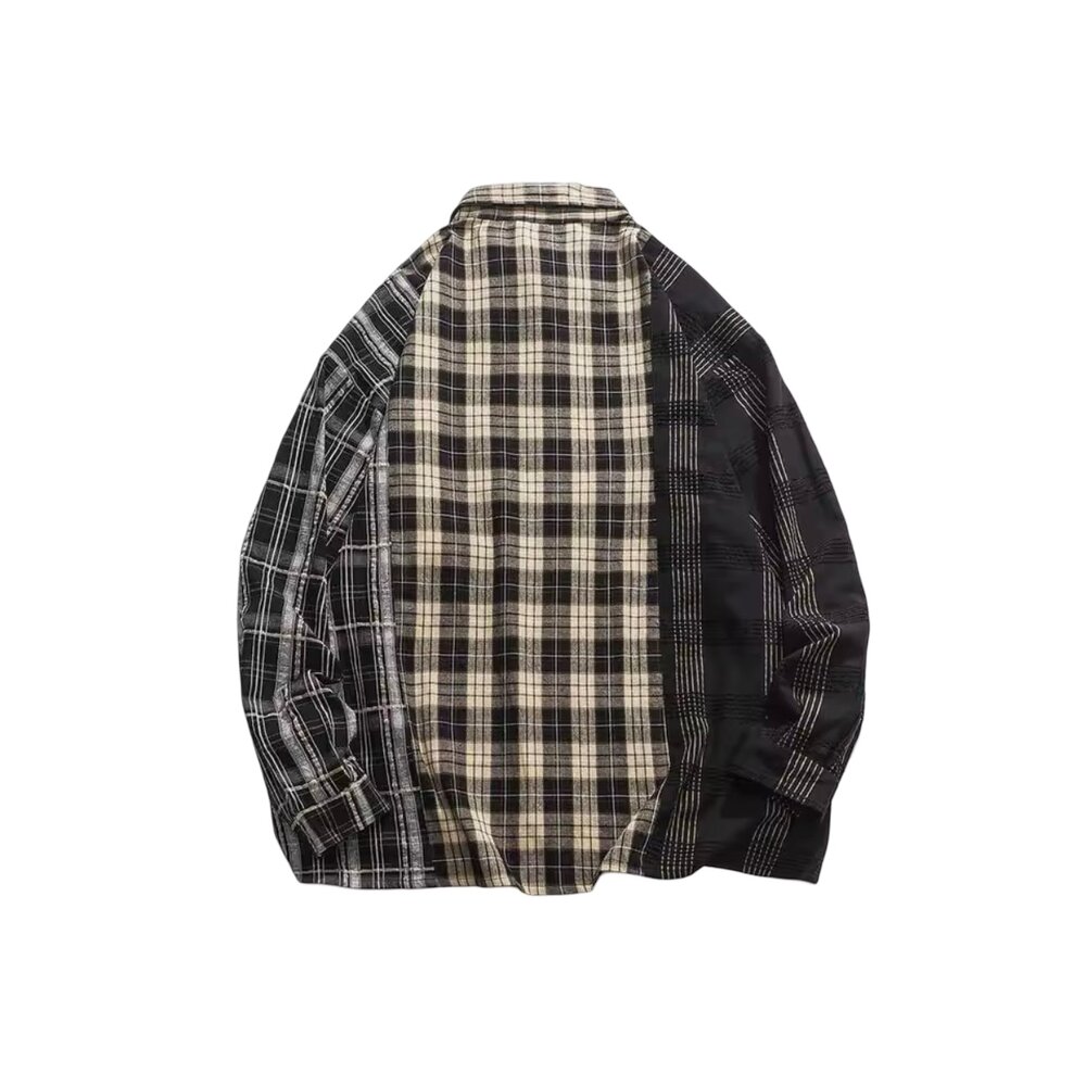 Crafted from an intricate composition of contrasting plaid textiles, the garment merges multiple traditional check motifs into one unified architectural statement. Deep charcoal tartans, muted taupe windowpanes, soft stone plaids, and warm earth-toned grids are meticulously panelled together, each section intentionally misaligned to create visual tension and layered dimension.