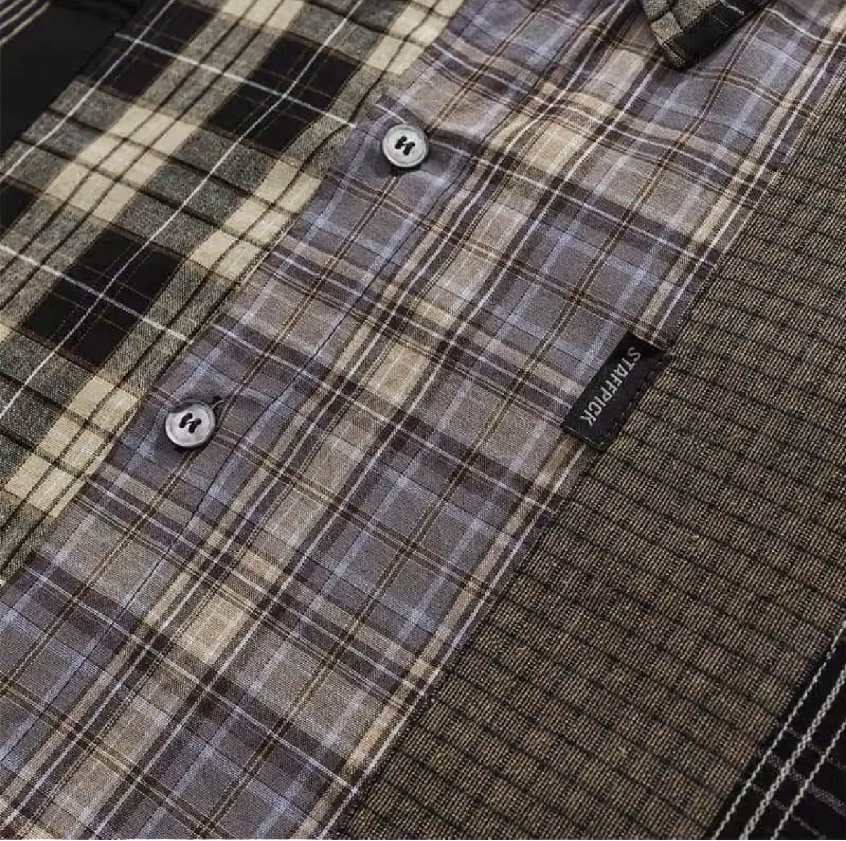 The shirt’s design philosophy embraces contrast—light against dark, fine grid against bold block, heritage against reinterpretation. From a distance, it reads as bold and editorial. Up close, the texture variation and thoughtful panel transitions reveal a meticulous attention to detail.