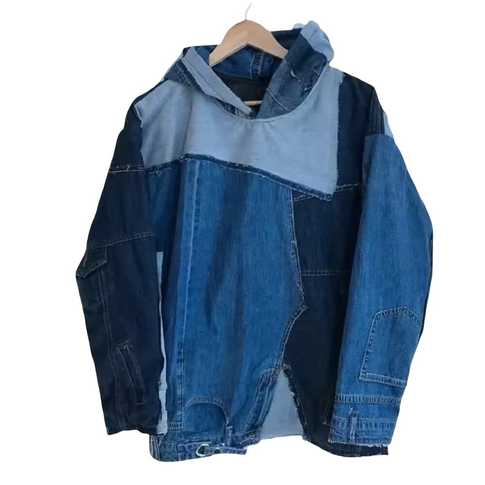 The “Indigo Reconstruction” Deconstructed Patchwork Denim Hooded Jacket is a masterclass in contemporary upcycling and architectural streetwear. Designed for those who appreciate craftsmanship over conformity, this piece transforms classic denim into a layered, asymmetrical statement garment that feels both industrial and elevated.