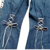The defining feature of this design lies in its symmetrical lace-up calf detailing, where cleanly stitched vertical slits are interwoven with soft cream cords tied into delicate bows. These adjustable laces are not merely decorative; they introduce a subtle customizable element, allowing wearers to tighten or loosen the structure for personalized styling. This romantic touch softens the rugged heritage of denim, bridging utility with femininity.