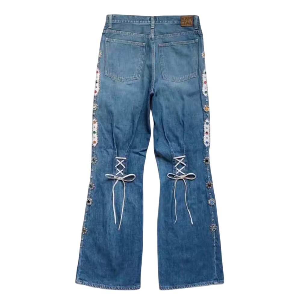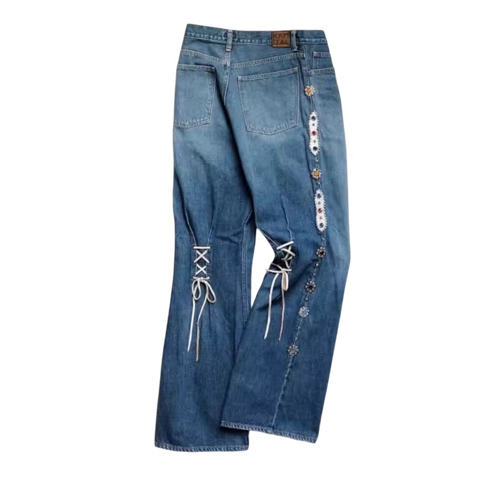 A poetic fusion of handcrafted charm and contemporary denim tailoring, the Meadowbound Lace-Up Embellished Flare Denim Trousers redefine everyday jeans as a wearable piece of art. Designed for the individual who gravitates toward expressive details and elevated casualwear, these trousers transform classic blue denim into an intricate canvas of texture, ornamentation, and movement.