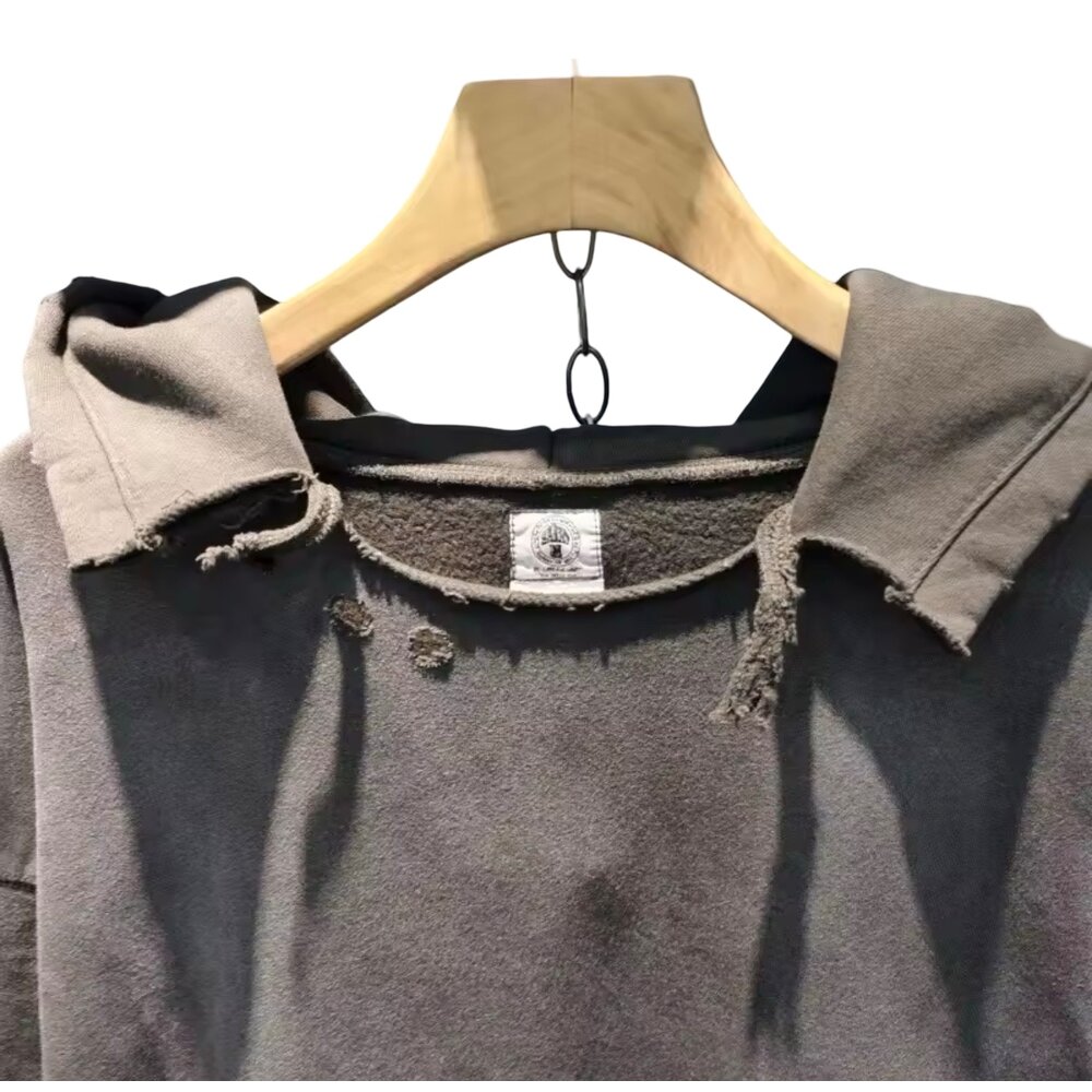 Distressing details are strategically and artistically placed rather than randomly applied. Subtle micro-abrasions along the collar edge, light puncture distressing on the torso and sleeves, and softly worn hems introduce character without compromising durability. These controlled imperfections evoke the essence of vintage heirloom streetwear—pieces that appear to have stories woven into every fiber. The hood itself is generously cut, designed to sit naturally whether worn up or down, with lightly frayed seam edges that enhance the artisanal aesthetic.