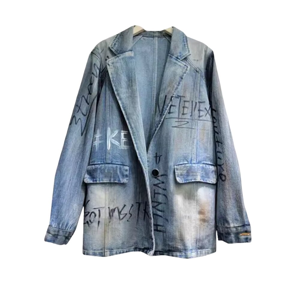 The “NeuroRain Manifesto” Distressed Denim Overcoat is where raw street expression collides with structured tailoring. Designed as a wearable canvas, this piece fuses classic overcoat architecture with rebellious hand-drawn graffiti artistry, transforming heritage denim into a conceptual statement garment.