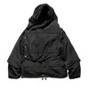 The oversized protective hood is a defining element, sculpted to create a dramatic profile while delivering genuine coverage against wind and precipitation. Integrated drawcord adjustments allow the wearer to customize fit and volume, transforming the hood from a relaxed drape into a secure shield. Complementing this feature is the convertible detachable weather panel, a bold rectangular storm flap that can be removed or affixed depending on styling preference or environmental demand. This modular component elevates the garment beyond traditional outerwear, granting the wearer multiple visual identities in a single piece.