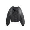 The hood is generously proportioned, designed to drape naturally while maintaining a clean forward frame. Its seamless integration into the neckline eliminates visual clutter, enhancing the hoodie’s futuristic simplicity. A cropped, boxy cut lends contemporary proportion, allowing the garment to pair effortlessly with high-waisted trousers, cargo pants, or layered longline pieces. Ribbed cuffs provide gentle structure at the wrists, while the hemline sits with a relaxed, slightly curved finish that enhances the sculptural drape.