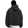 The defining feature is the raised vertebrae-inspired spine motif sculpted along the back panel—an embossed, padded formation that mimics organic anatomical structure while remaining abstract and modern. This dimensional detailing introduces depth, movement, and tactile intrigue, transforming the rear silhouette into an architectural centerpiece. Complementary padded accents extend onto the sleeves and shoulder zones, reinforcing the garment’s armor-like aesthetic while maintaining flexibility and wearability.