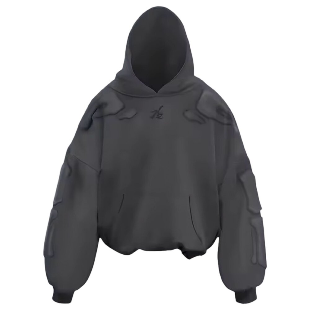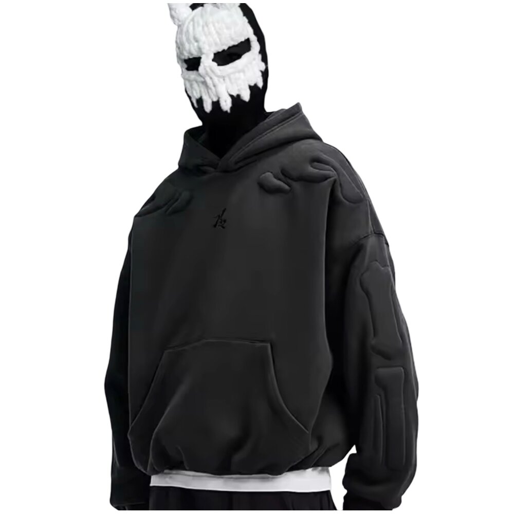 Crafted from a premium heavyweight cotton-poly fleece blend, the fabric offers a dense, structured exterior balanced by a soft brushed interior that delivers warmth and comfort without sacrificing form. The deep obsidian black coloration is intentionally matte, absorbing light to create a shadow-like presence that enhances its sculptural elements. Rather than relying on prints or loud branding, the hoodie achieves visual impact through subtle relief textures and three-dimensional contouring.