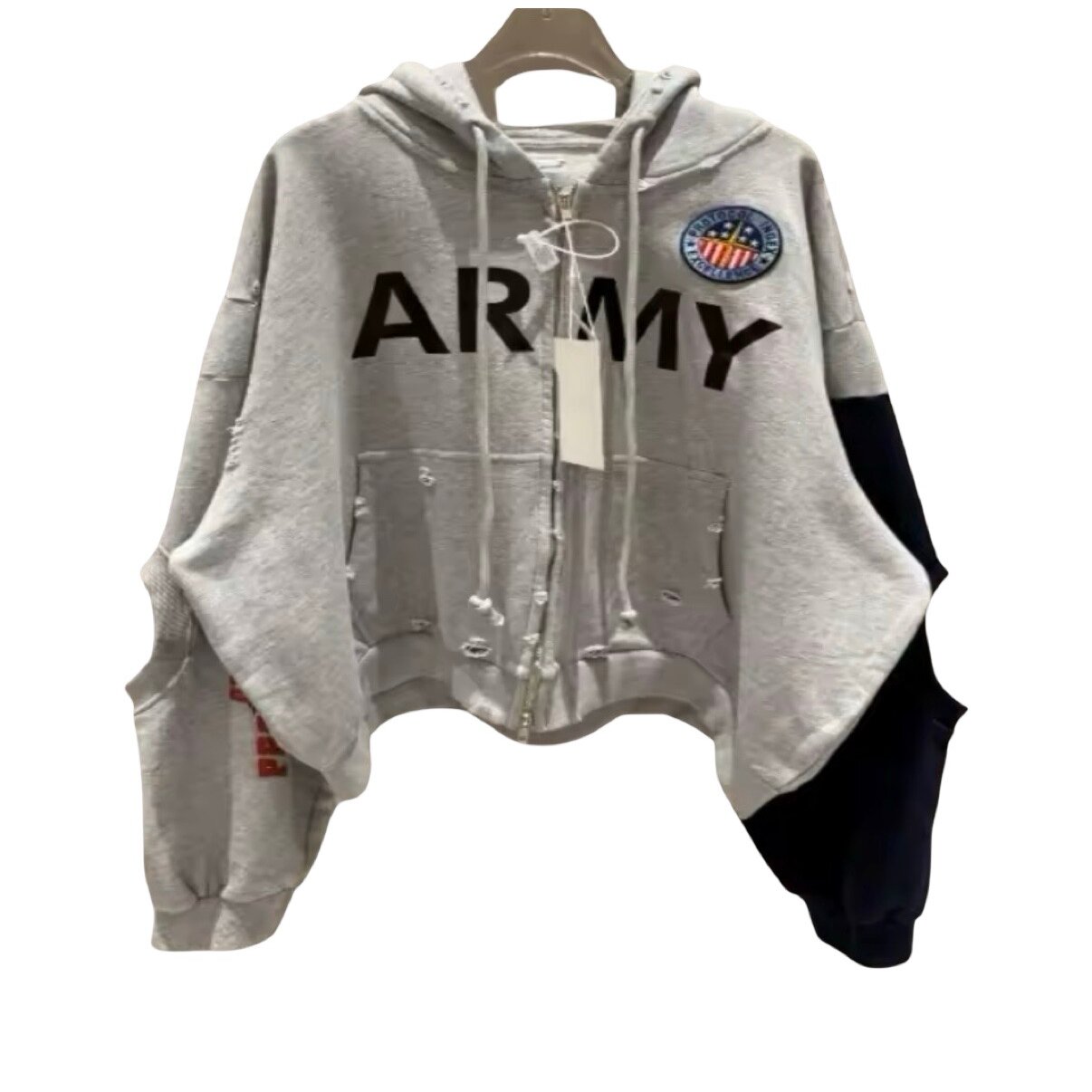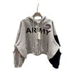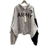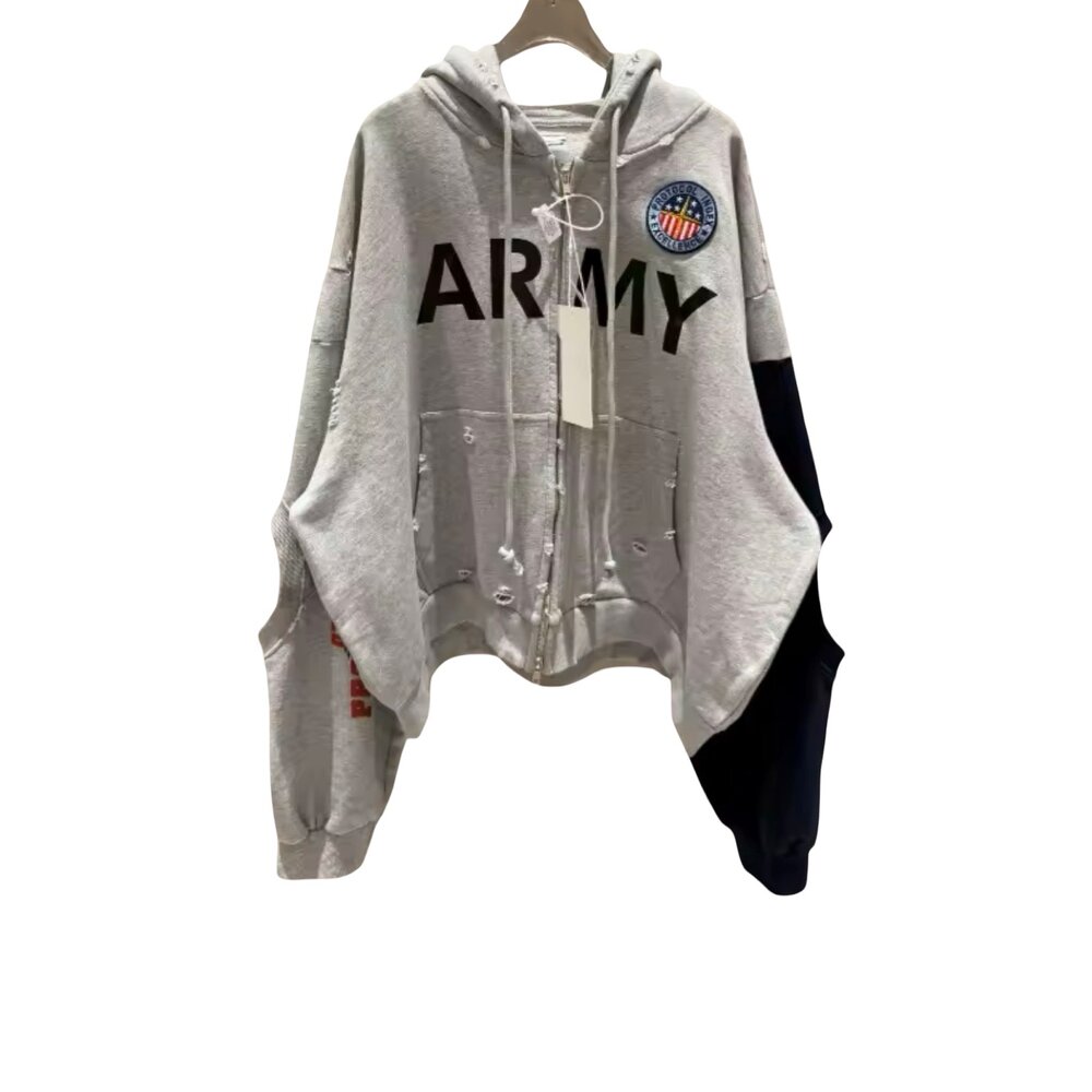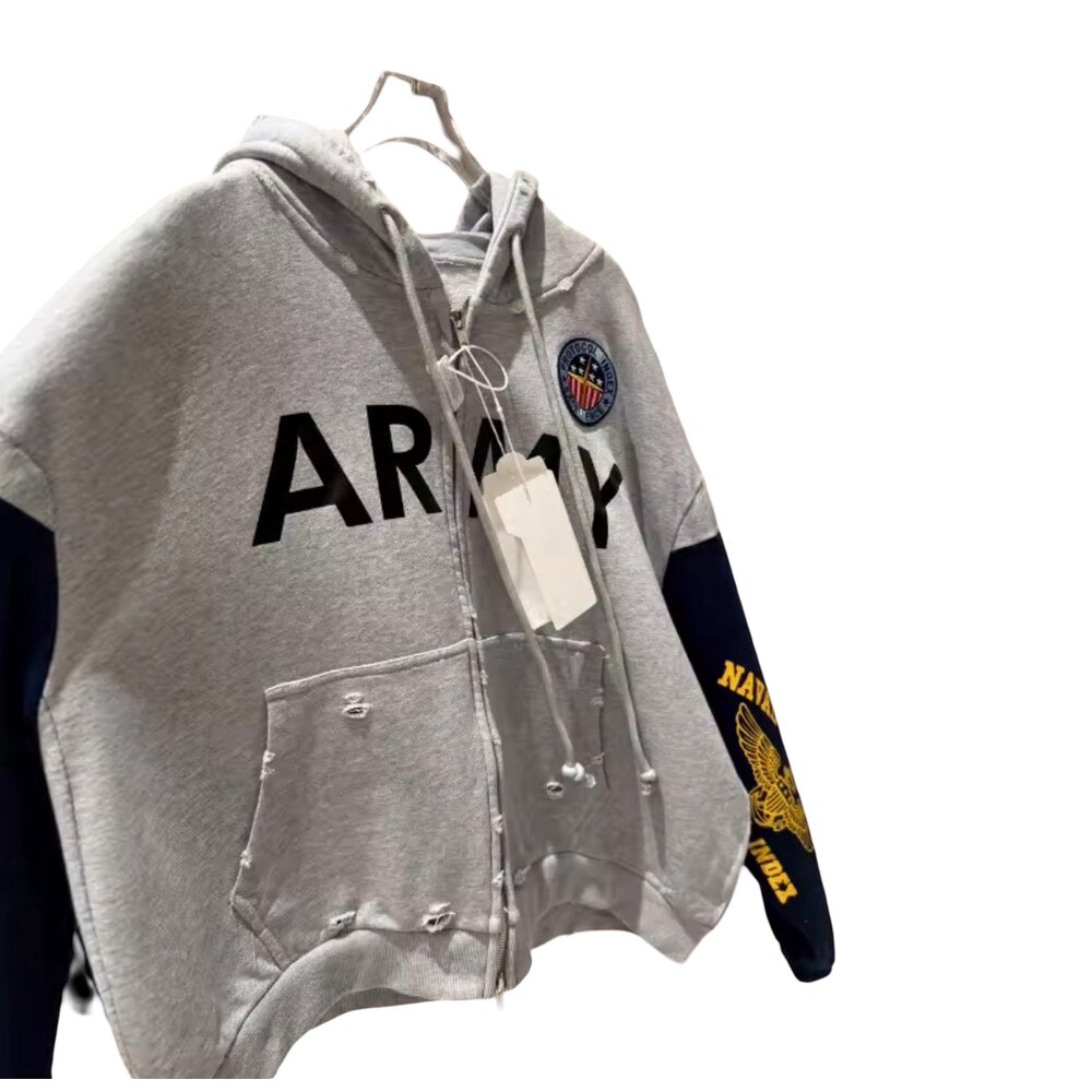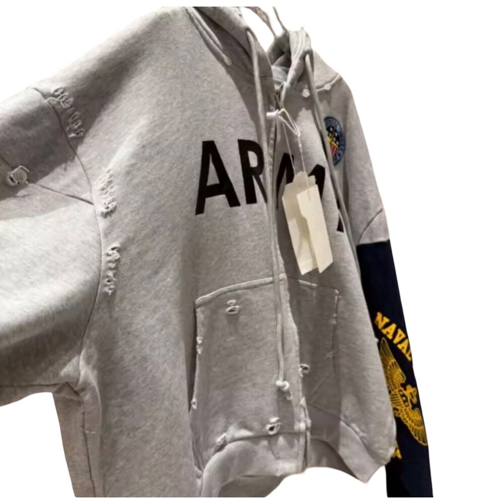 Key Features: • Premium cotton-blend fleece with soft interior comfort • Oversized relaxed silhouette for modern streetwear layering • Full-length zipper front closure • Bold “ARMY” typography across chest • Multi-color crest patch detail • Distressed kangaroo pocket and hem accents • Asymmetric split-sleeve construction in grey and navy • Gold eagle-style sleeve insignia and red text sleeve detailing • Large back graphic with vertical branding text • Ribbed cuffs and adjustable hood drawstrings
