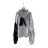 One of the most defining features is the split-sleeve contrast design. The left sleeve appears in a deep navy tone with a bold gold eagle-inspired insignia graphic, evoking vintage collegiate and military iconography. The right sleeve returns to the heather-grey palette but incorporates red vertical text accents and additional distressing, producing a deliberate asymmetry that amplifies the hoodie’s avant-garde appeal. Ribbed cuffs ensure a secure yet comfortable fit at the wrists.