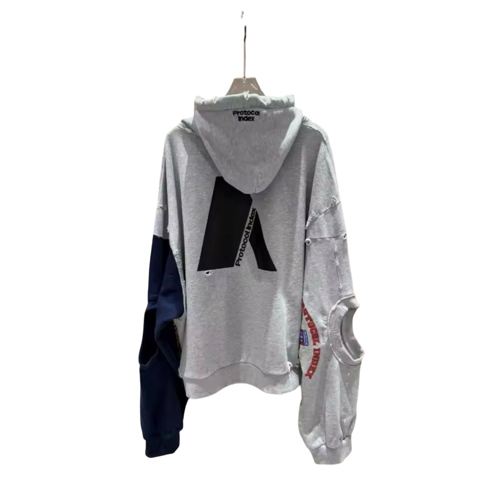 The back continues the narrative with a large, stylized black graphic element paired with vertical “Protocol Index” text, reinforcing the garment’s contemporary identity and brand-forward presence. Subtle abrasions along the hem and hood edge create a worn-in aesthetic that feels curated rather than accidental. The hood itself is generously sized, lined for comfort, and finished with adjustable drawstrings tipped in matching tones for cohesion.