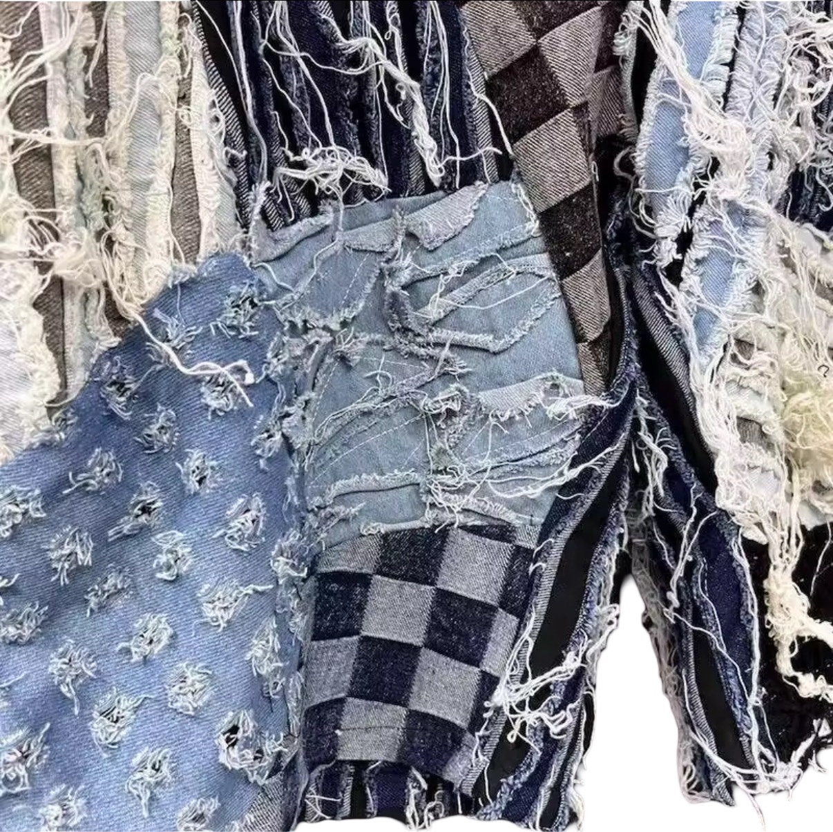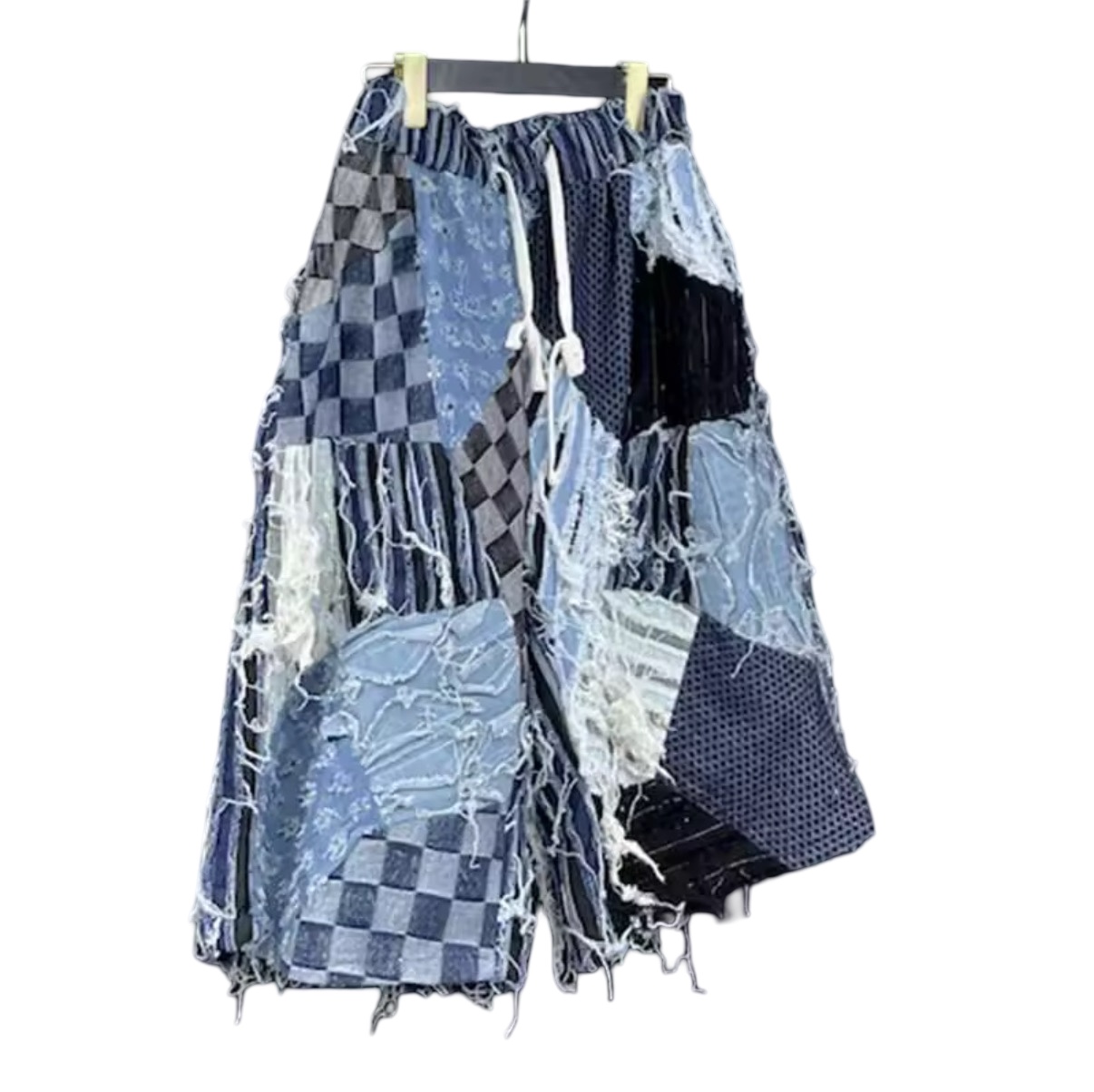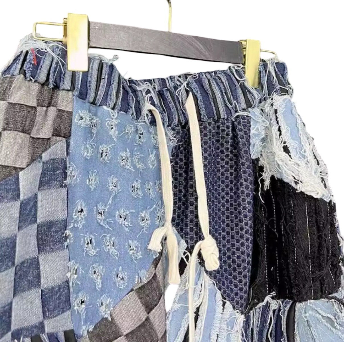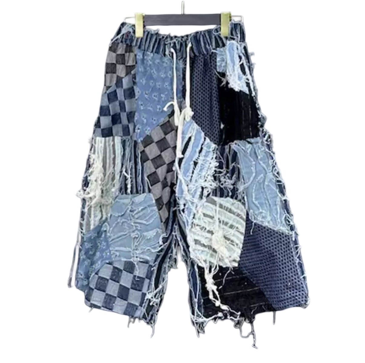 Constructed from an array of mixed indigo and navy fabrics, these shorts showcase hand-assembled patch panelsfeaturing contrasting textures, patterns, and weaves. Checkered denim, distressed twill, perforated textiles, striped fabric, and soft mesh-like materials are layered together in a deliberately irregular composition. Each panel is intentionally raw-edged, with visible fraying and loose threads that celebrate imperfection as design language.