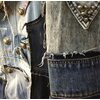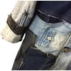 The silhouette features a relaxed oversized cut with a structured lapel collar that merges classic tailoring with streetwear rebellion. Brass-tone hardware accents the front placket, delivering a subtle metallic contrast against the muted denim palette while reinforcing durability and premium construction. Functional pocket placements are reimagined through layered patch designs, blending utility with artistic asymmetry. Sleeves showcase alternating denim textures and tonal striping, while selective stud embellishments introduce a refined industrial edge without overpowering the overall composition.