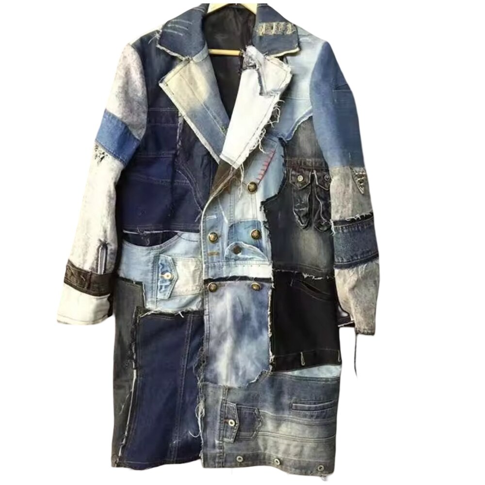 The “Reconstructed Relic” Couture Patchwork Denim Overcoat is a statement-driven fusion of archival denim heritage and avant-garde streetwear craftsmanship. Designed for individuals who embrace originality over conformity, this longline coat transcends conventional outerwear by transforming reclaimed textures, distressed finishes, and asymmetrical tailoring into a wearable art form. Each panel appears intentionally curated, creating a layered narrative of fabric, tone, and time that feels both nostalgic and boldly contemporary.