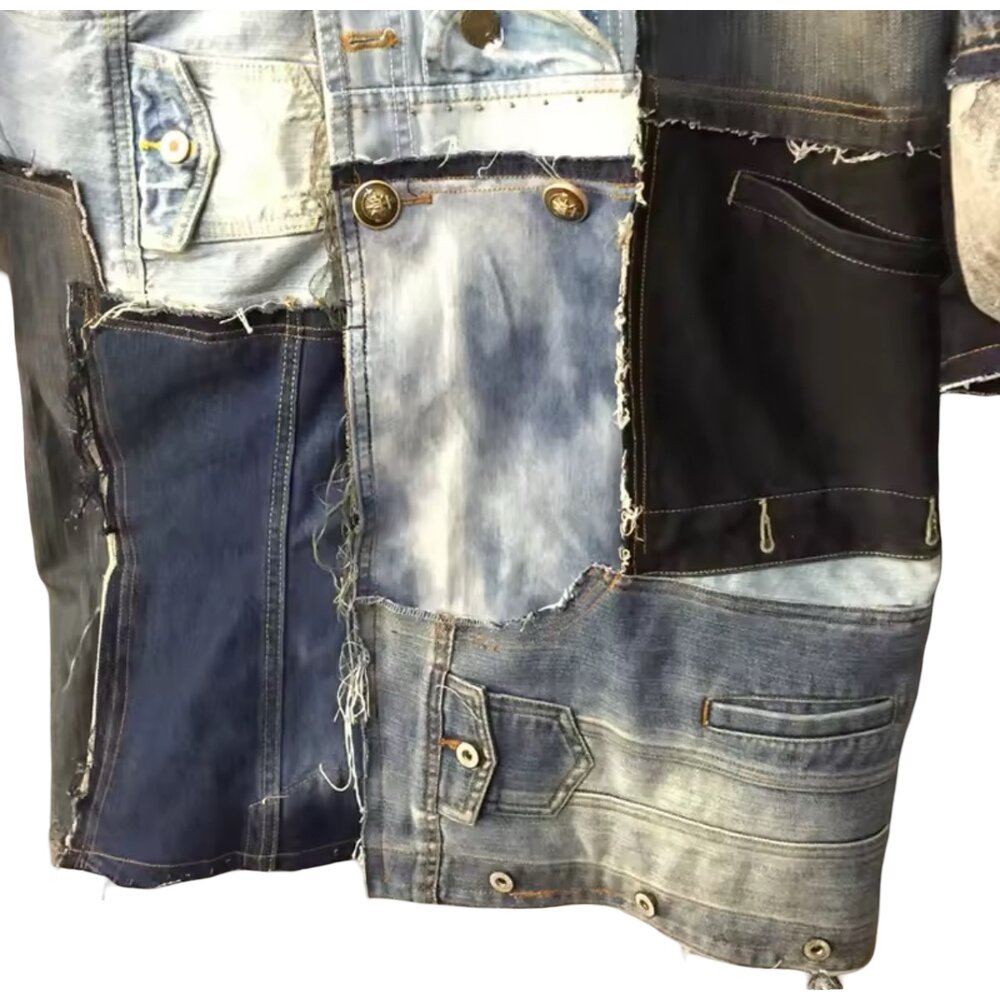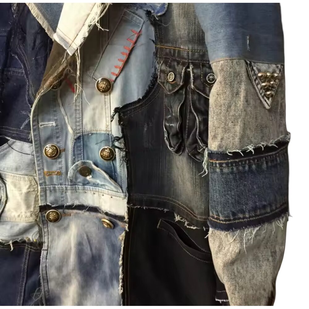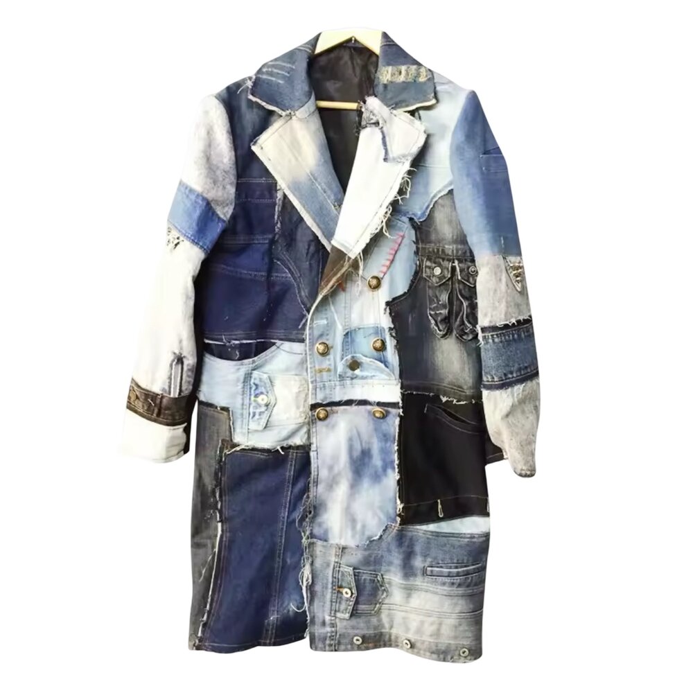 Crafted from a mosaic of multi-wash denim panels ranging from deep indigo to sun-faded blue and vintage ash tones, the coat embodies a rugged yet refined aesthetic. Raw edges, exposed seam allowances, and frayed borders celebrate the beauty of imperfection—an homage to the deconstructed fashion movement where authenticity and individuality reign supreme. Every stitch, every contrast panel, and every distressed gradient is placed with deliberate intention, resulting in a garment that feels sculptural rather than simply sewn.