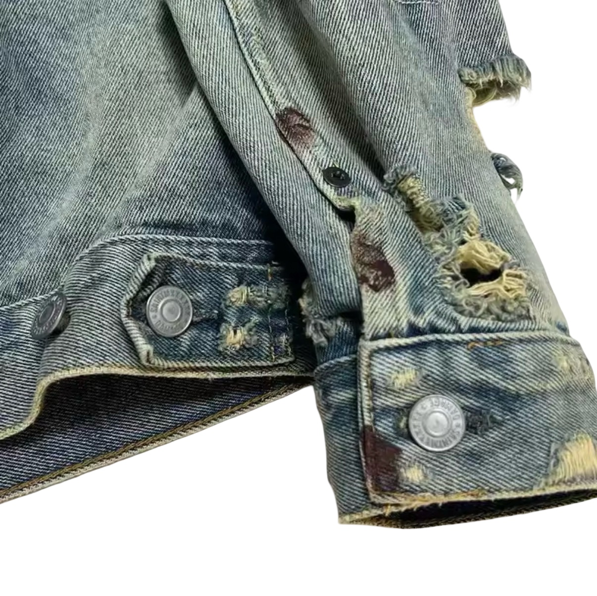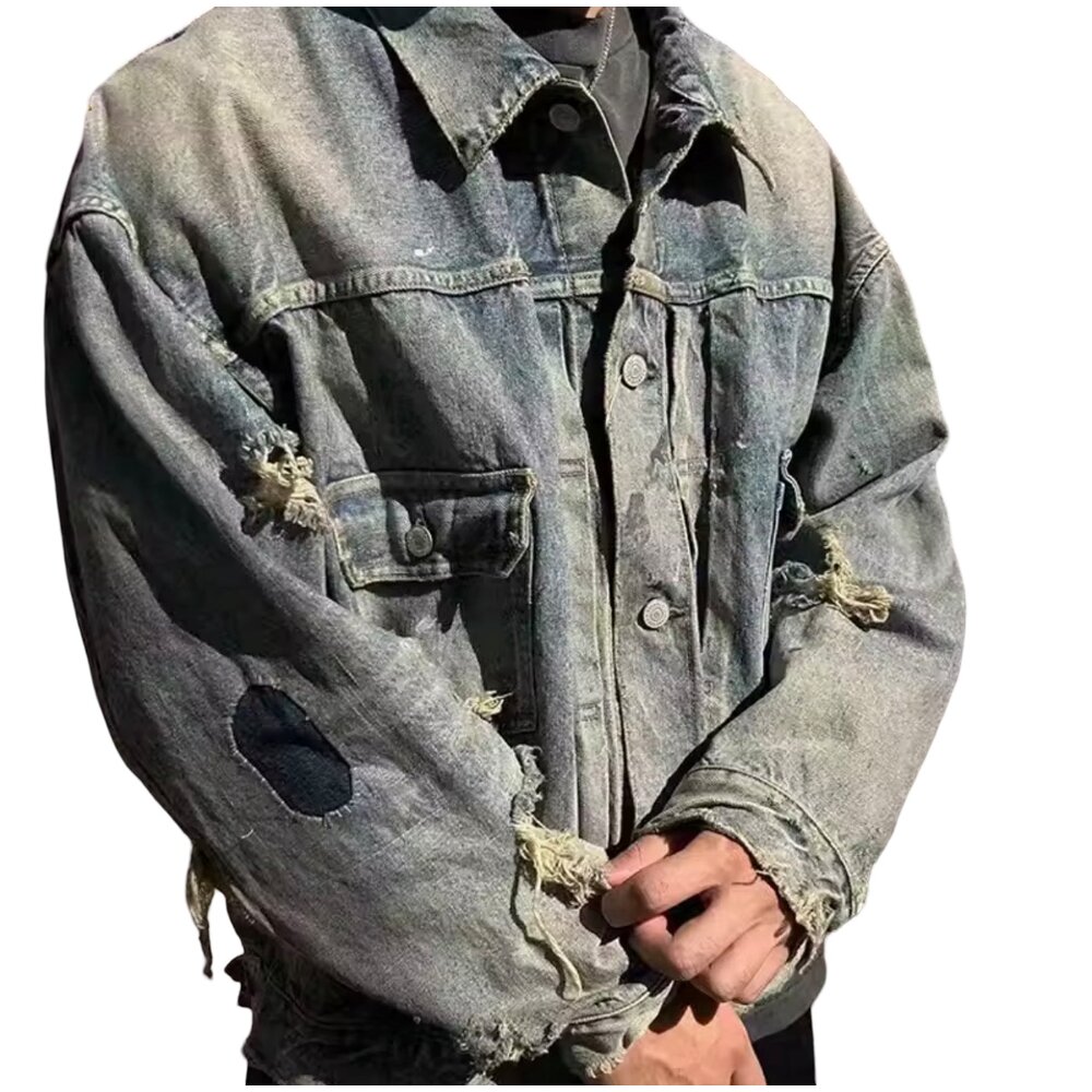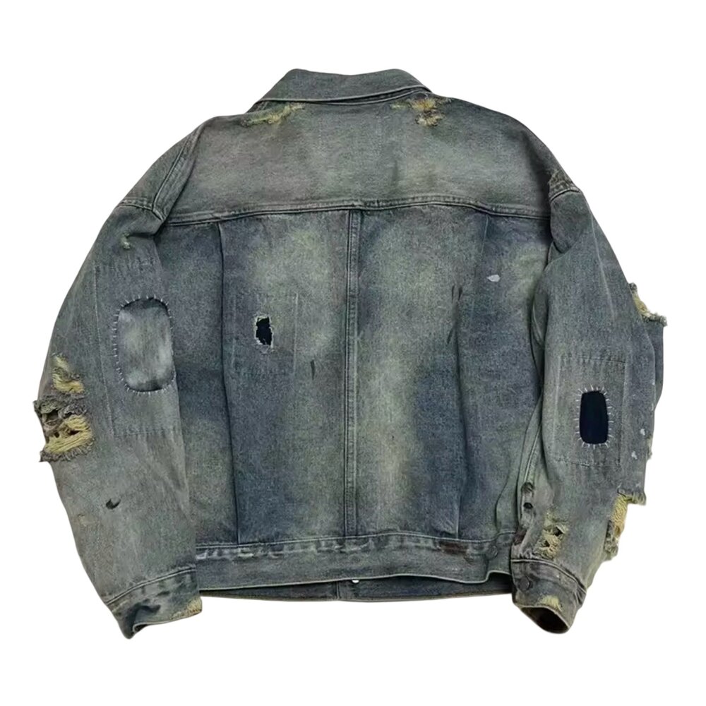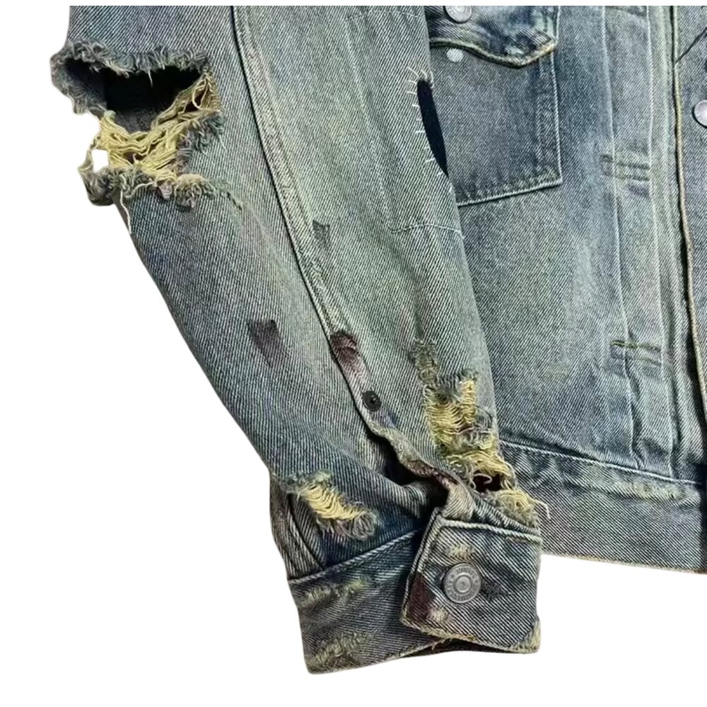 The silhouette honors the timeless trucker framework: structured collar, button-front closure, dual chest flap pockets, and side seam detailing. However, this edition transcends tradition through meticulously executed distressing. Strategic abrasions, frayed rips, and exposed threadwork create texture without compromising construction. Each tear is reinforced from within to preserve durability while showcasing raw, expressive edge. Distressed zones along the sleeves and body introduce contrast between intact denim and organically unraveled fibers, resulting in a layered, tactile aesthetic.