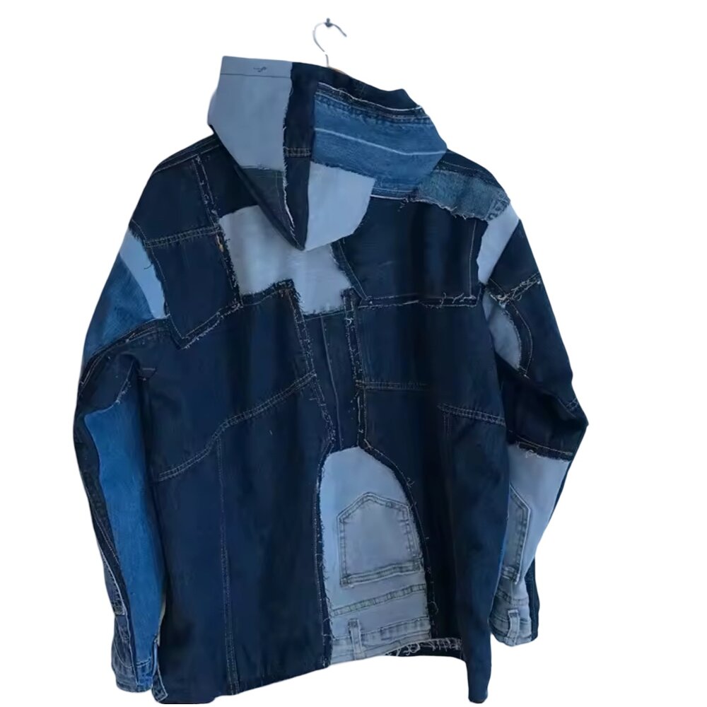 Constructed from a curated blend of light-wash, mid-wash, and deep indigo denim segments, the jacket showcases a masterful patchwork technique where visible seam lines, tonal stitching, and intentionally frayed edges form an architectural grid of textile artistry. The hood extends the garment’s layered narrative, featuring alternating denim tones that create a sculptural silhouette when worn up or down. This multidimensional construction produces a dynamic interplay of light and shadow, ensuring the piece looks distinct from every angle.
