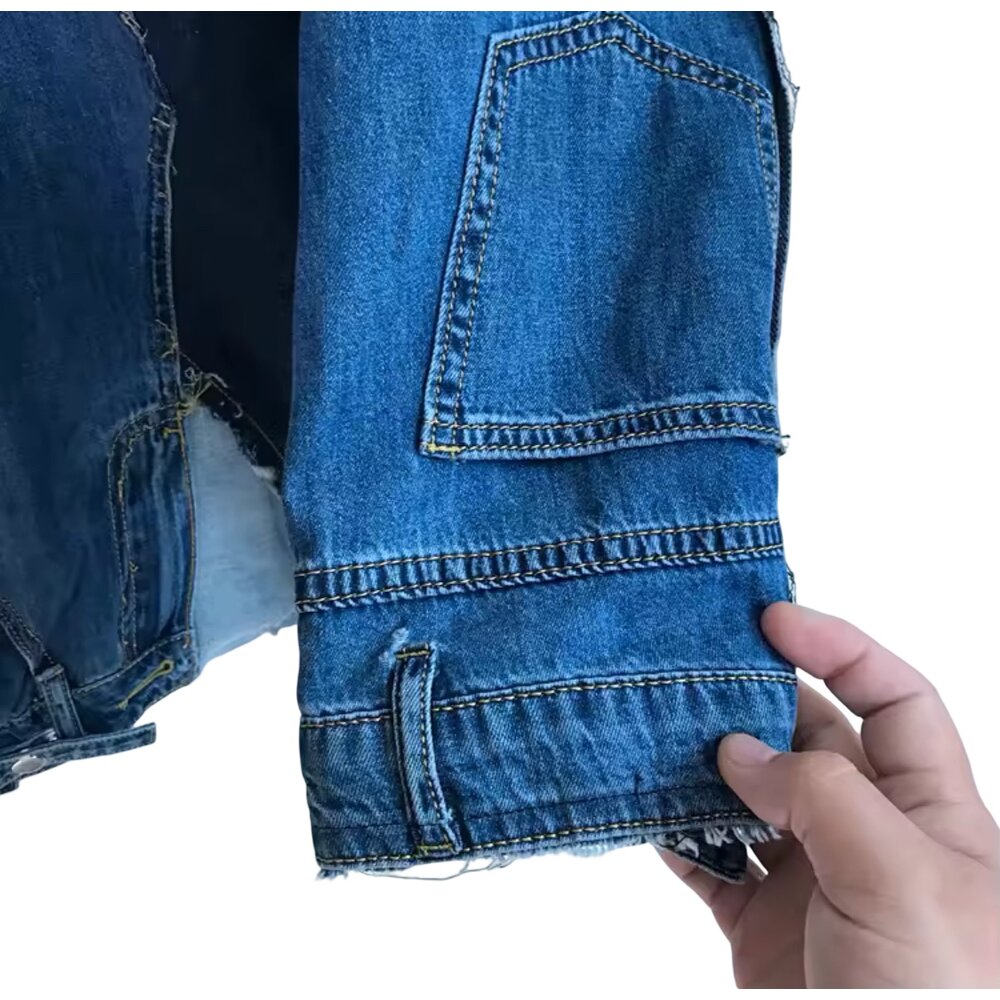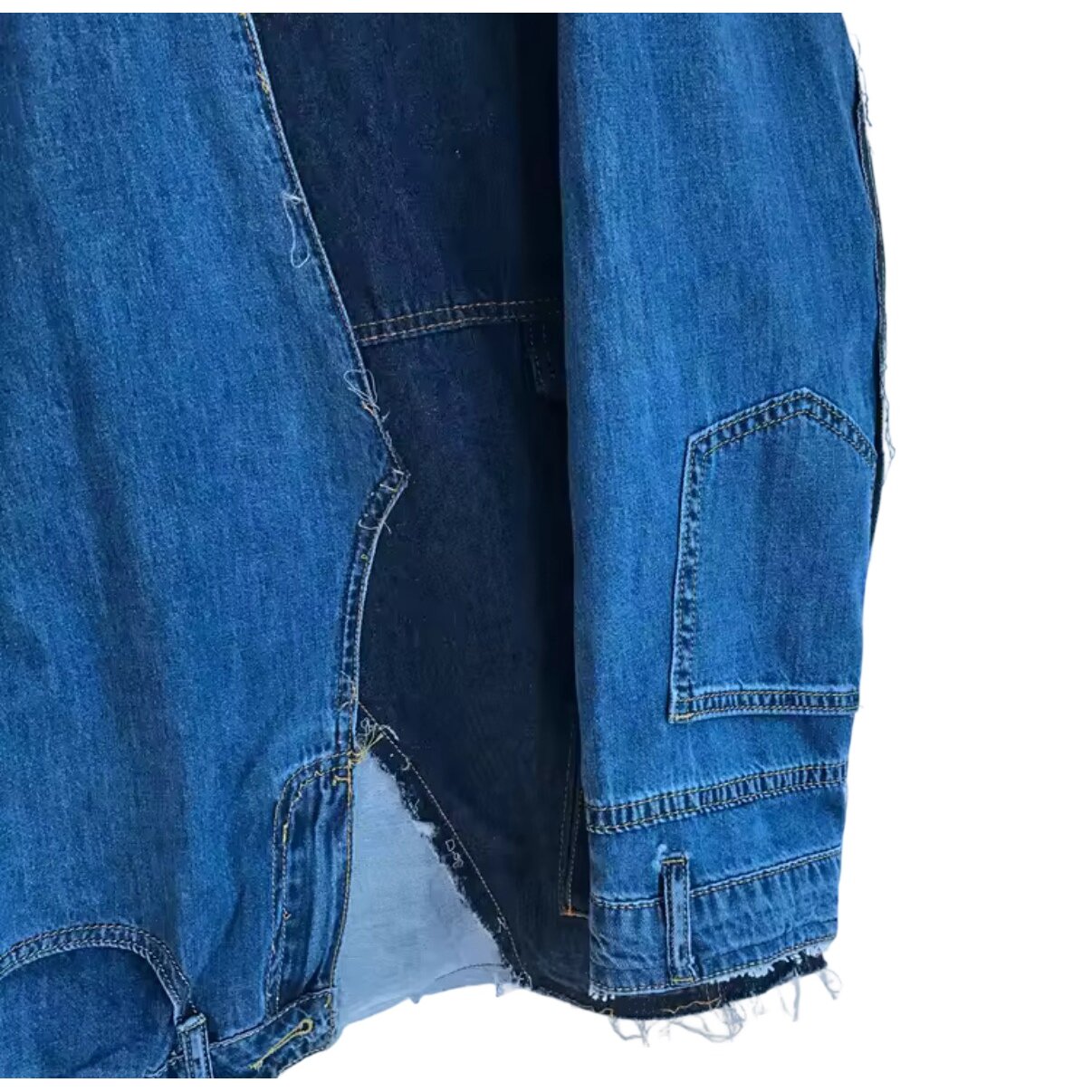 Interior stitching is reinforced for durability, while exterior seams remain intentionally exposed to celebrate the garment’s raw construction ethos. The jacket’s denim composition provides medium-weight warmth, making it suitable for transitional seasons and versatile layering. Pair it over a minimalist tee for casual street styling or over a hoodie and cargos for a bold, editorial-inspired ensemble.