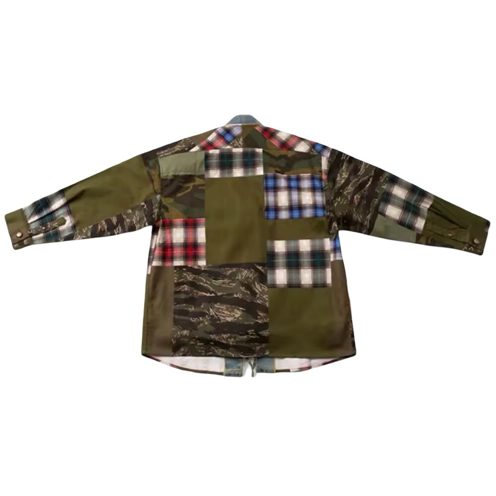 The back panel is where the artistry fully unfolds — an intricate grid of plaid patterns in red, blue, white, and forest tones layered against olive and camo fields. The balanced geometry creates a quilted mosaic effect without excess bulk, allowing the garment to drape naturally while maintaining structural integrity.