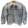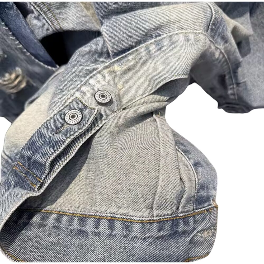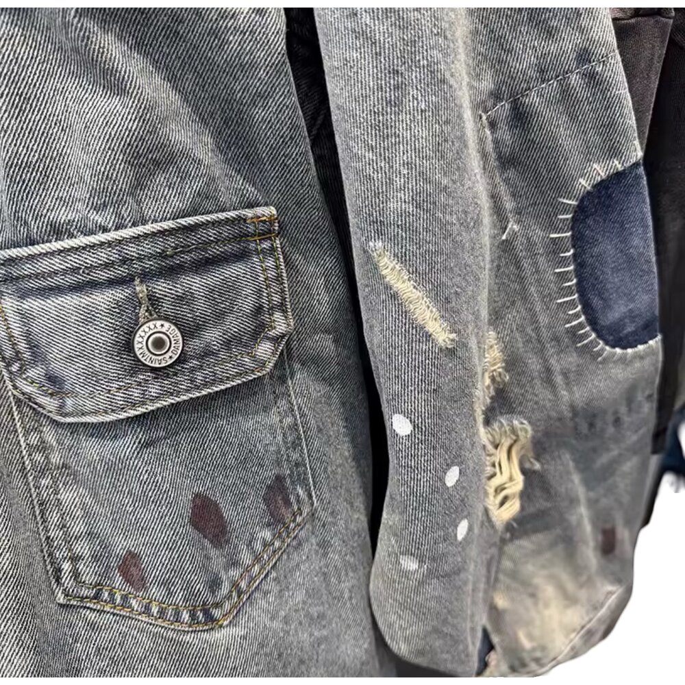 Crafted from premium-weight denim, the fabric showcases a multi-tonal stonewash palette that shifts between cool ash blues and muted charcoal hues, producing a dimensional visual depth rarely found in standard denim garments. The surface is intentionally weathered with hand-finished abrasions, subtle paint flecks, and tonal fading that emulate years of organic wear while preserving structural integrity. Every distressed mark is purposefully positioned, creating a balanced aesthetic that feels both spontaneous and thoughtfully engineered.