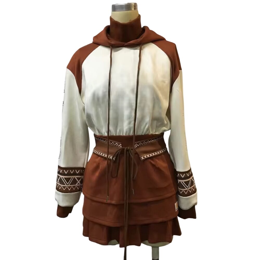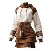 The upper bodice features a cream-toned knit hoodie with warm cinnamon-brown raglan shoulders and hood, creating a harmonious earth-tone contrast. The relaxed fit through the torso is balanced by a softly gathered waistline that transitions seamlessly into a structured belt panel, sculpting the silhouette with intention.