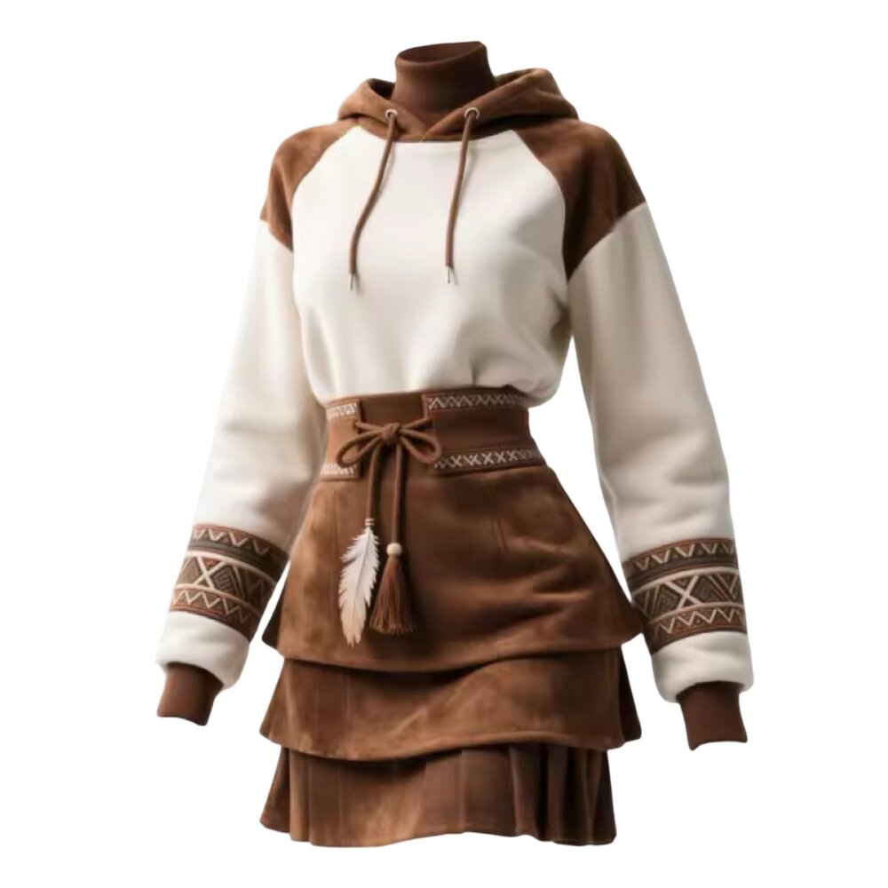 Rooted in heritage tones and elevated by modern tailoring, the “Canyon Spirit” Hooded Layered Skirt Set is a striking fusion of cozy streetwear and refined artisanal detailing. Designed for the woman who embraces softness with strength, this two-piece-inspired silhouette blends relaxed comfort with sculpted definition.