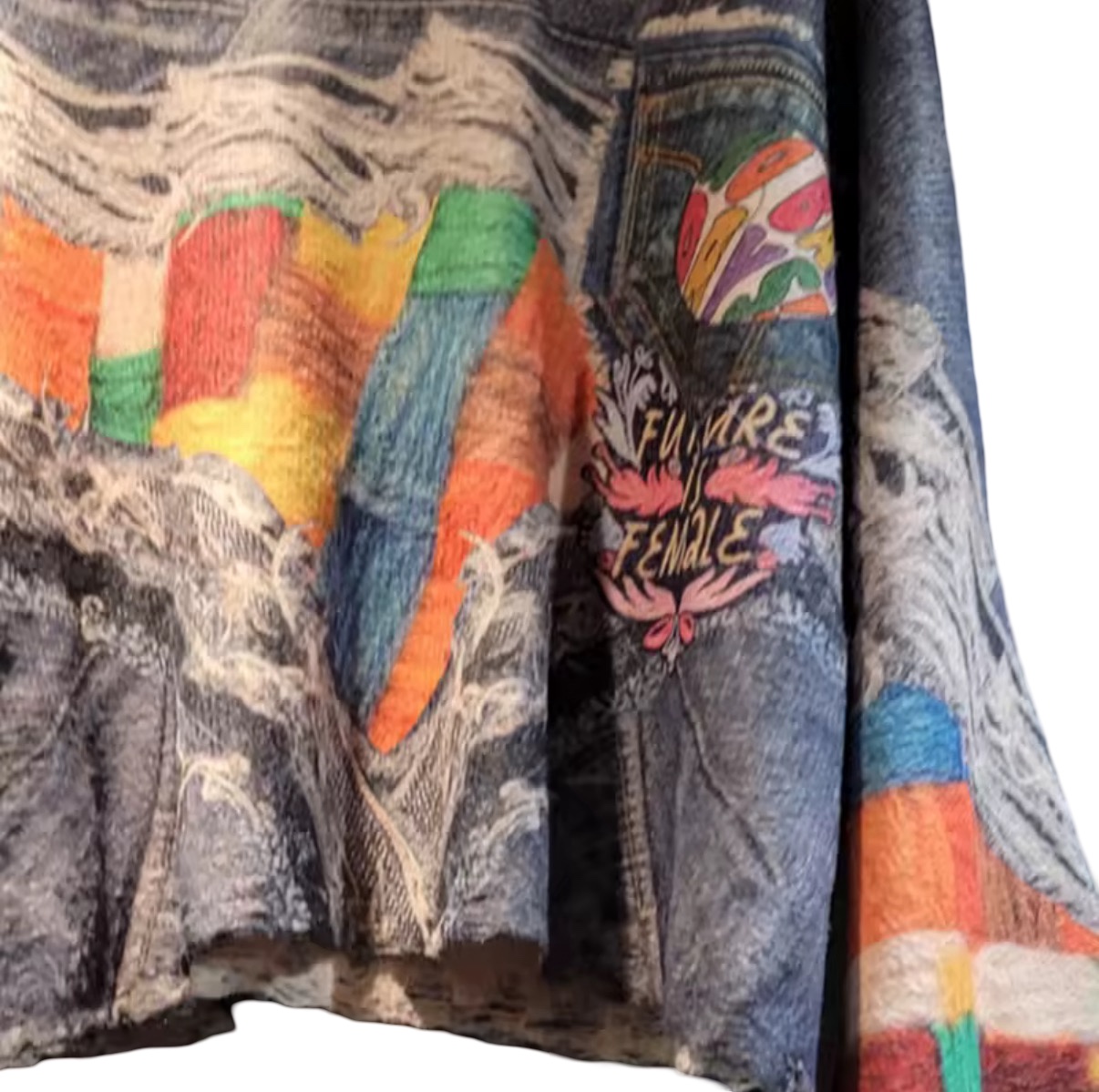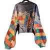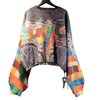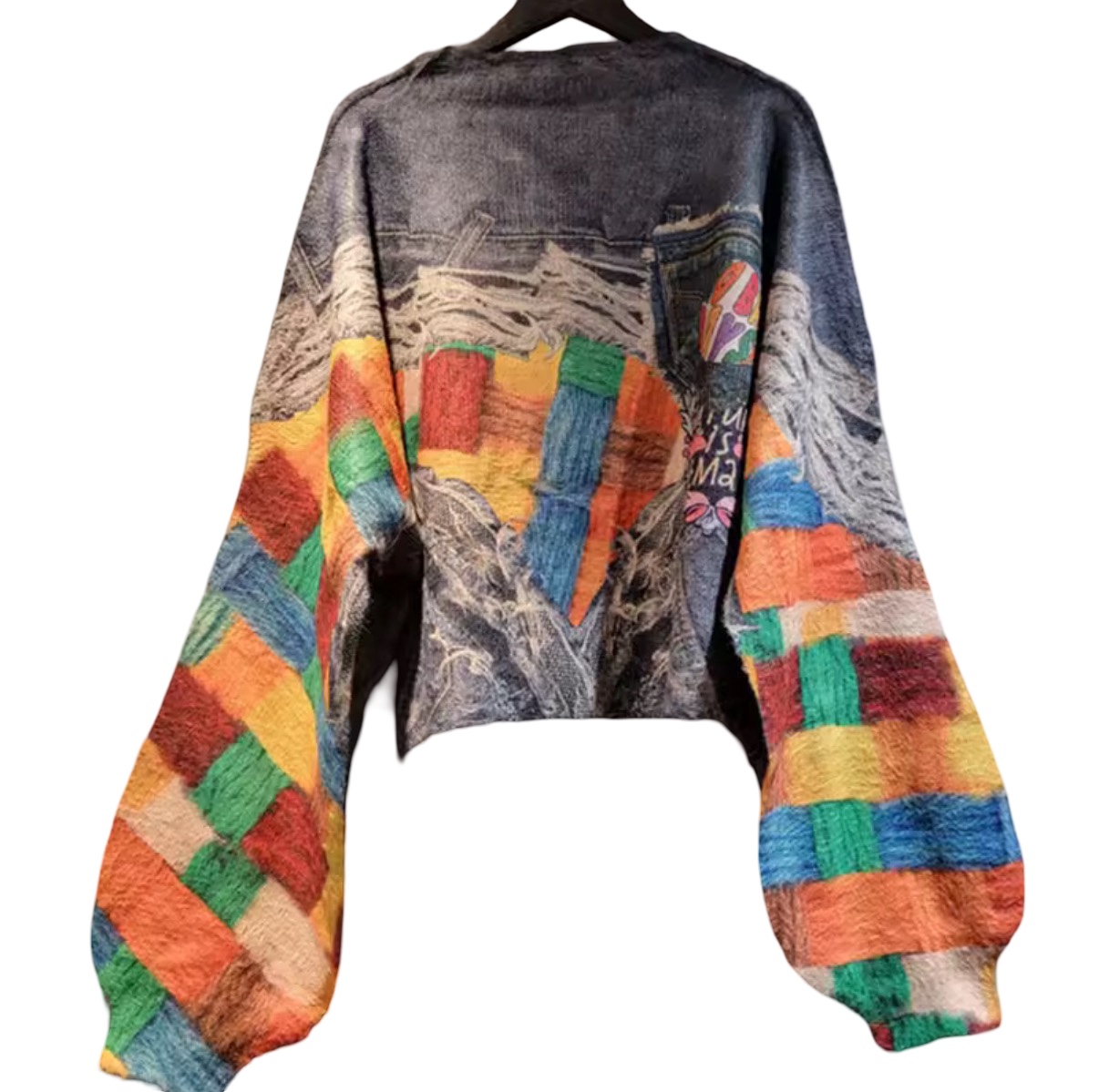 The silhouette is relaxed and architectural, offering a cropped, slightly boxy body balanced by dramatically voluminous sleeves. These sleeves feature bold color-block patterns in warm and cool tones—rust, teal, gold, green, and denim blue—creating dynamic contrast against the weathered indigo background. The interplay of textures—soft knit, structured denim, and woven textile—adds depth and dimension from every angle.