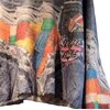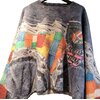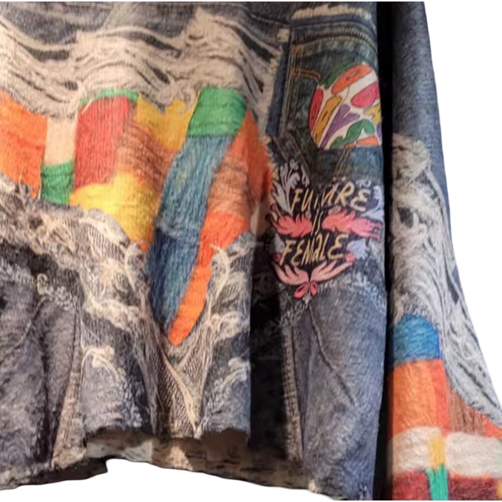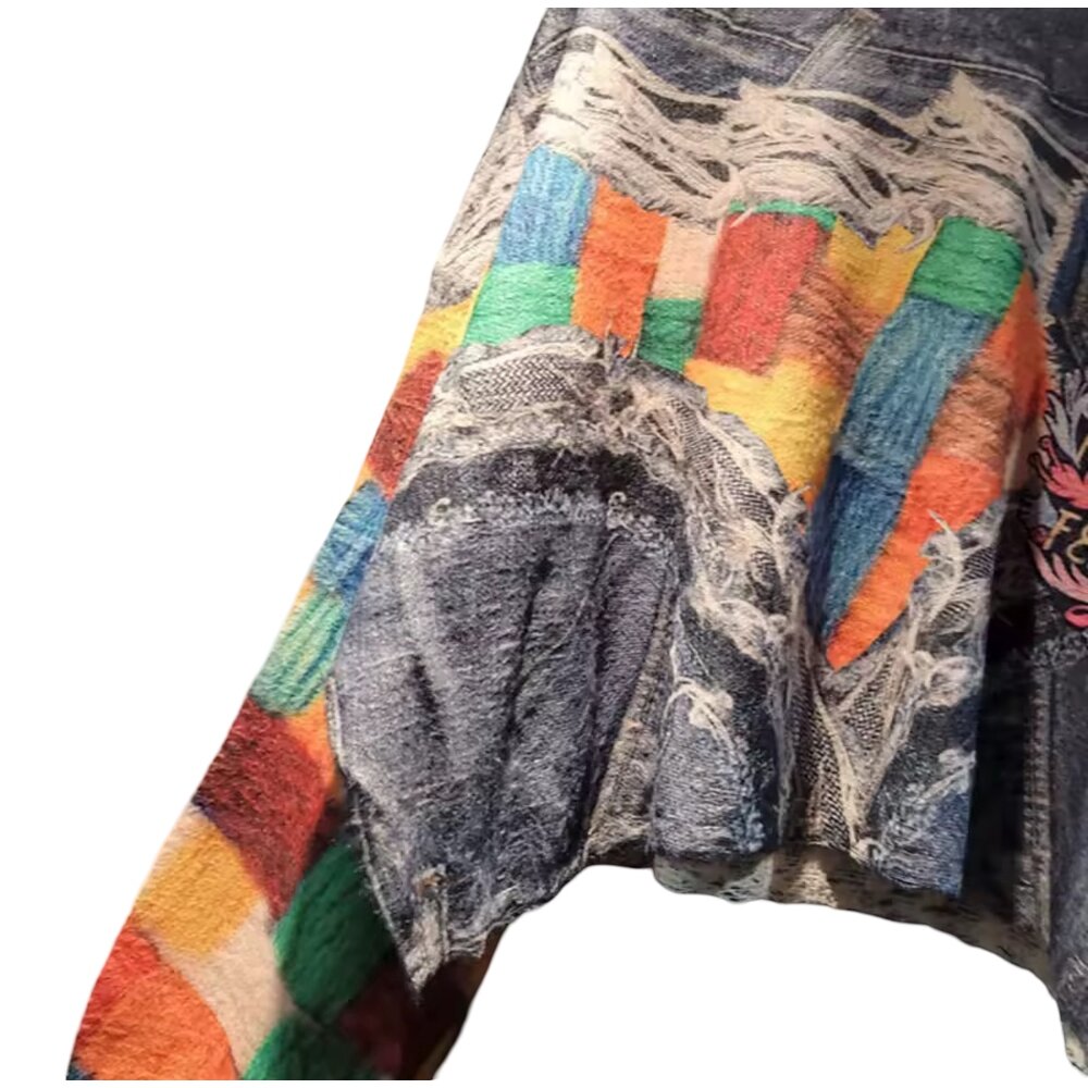 This pullover is crafted with a deconstructed denim base, layered and fused with vivid multicolor woven panels that appear almost painterly in composition. The surface tells a tactile story—frayed threads, raw edges, and distressed textures intentionally preserved to celebrate imperfection, transformation, and rebirth through material. Each section feels discovered rather than manufactured, evoking the soul of reclaimed garments reimagined into a single cohesive form.