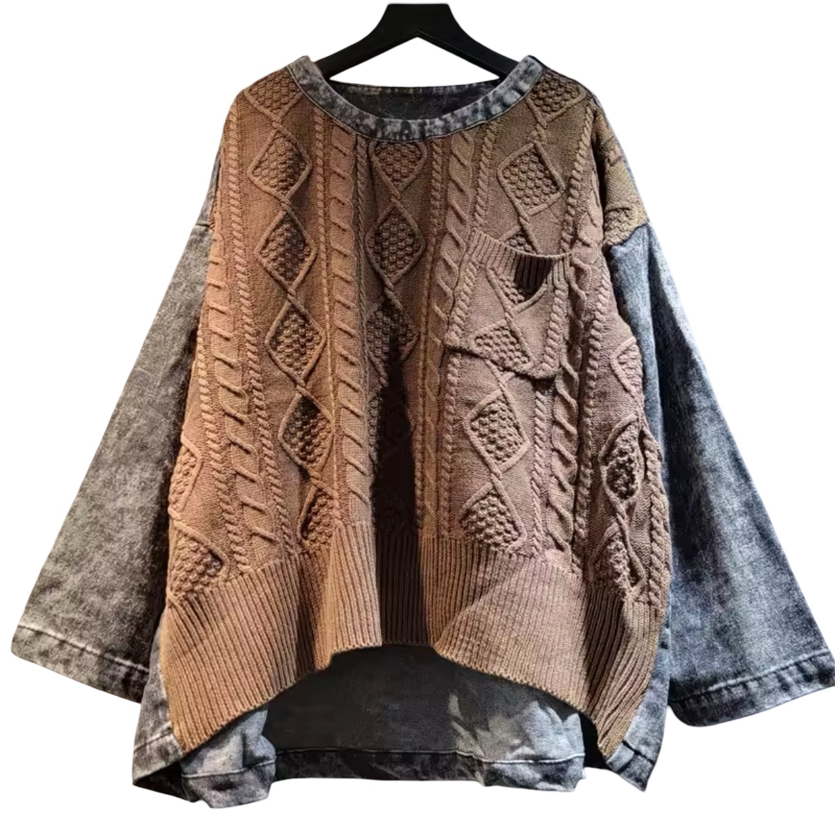 • Hybrid construction combining cable-knit sweater body with washed denim sleeves and back