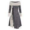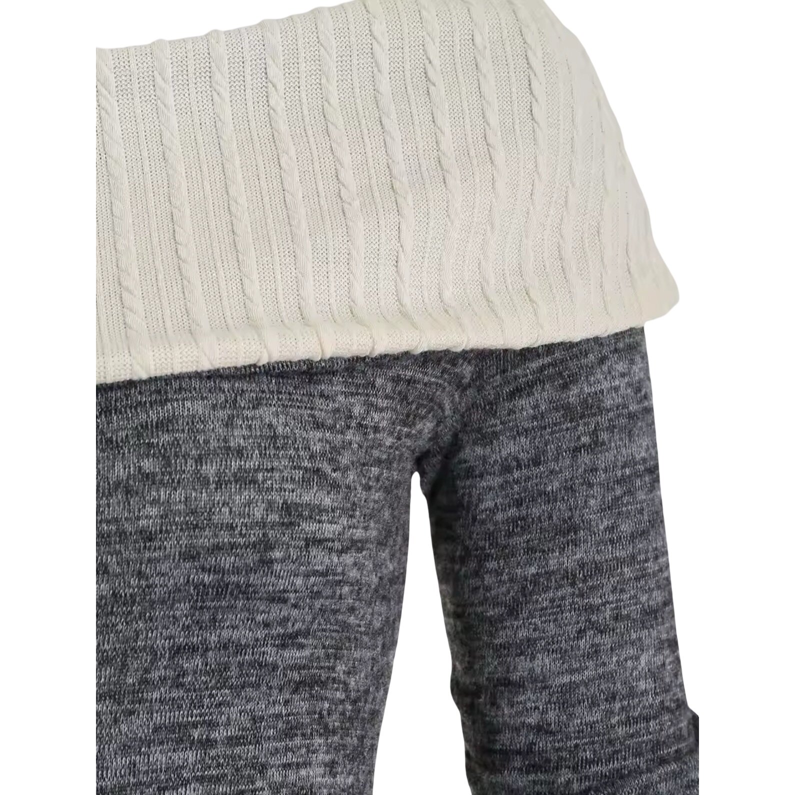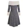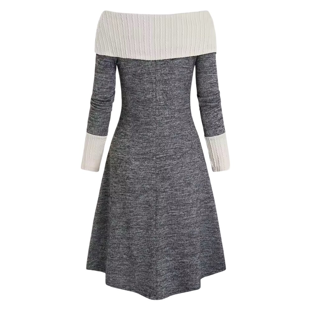 The dress is rendered in a marled charcoal-gray knit, offering depth and visual texture while remaining effortlessly versatile. A dramatic fold-over off-the-shoulder collar in ivory cable knit frames the neckline, creating a striking contrast in both color and stitch pattern. This wide collar drapes elegantly across the shoulders, lending a refined, almost sculptural presence to the upper body.