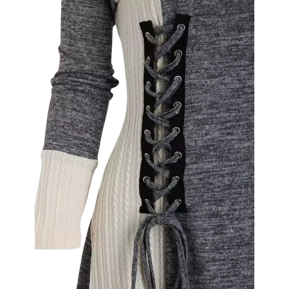 At the waist, a corset-style lace-up panel commands attention. Anchored by matte black eyelets and threaded with tonal gray cord, this vertical detail cinches the silhouette while introducing a handcrafted, atelier-level aesthetic. Beneath the lacing, an ivory cable-knit insert peeks through, adding dimensional layering and visual intrigue without overwhelming the design.