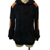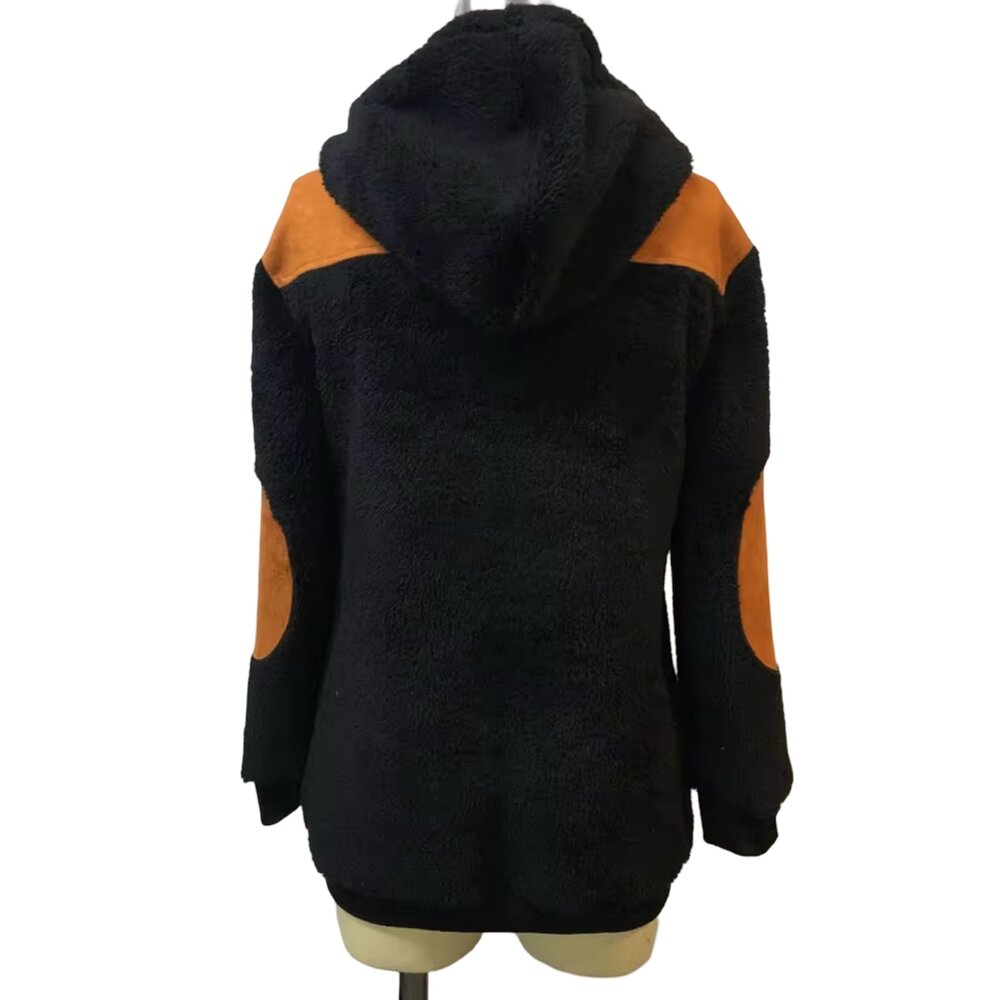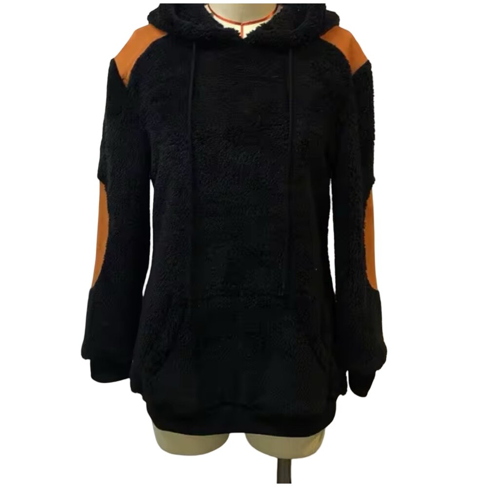 Strategically placed caramel-brown suede contrast panels across the shoulders and elbows introduce a refined ruggedness, evoking heritage outerwear influences while maintaining contemporary minimalism. These panels are more than decorative accents — they provide durability in high-wear zones while adding tonal warmth that balances the hoodie’s dark base. The suede’s velvety finish contrasts beautifully against the tactile sherpa, resulting in a multidimensional design that feels intentional, premium, and architecturally composed.