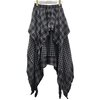 Designed with a soft elastic waistband, the skirt offers effortless comfort while allowing the layered construction to drape naturally from the waist. Multiple fabric panels cascade downward in asymmetric, handkerchief-style hems, creating dramatic points and folds that move fluidly with the body. Each panel features a distinct plaid variation—ranging from muted browns and earth tones to deep charcoal and grayscale—giving the garment a richly textured, patchwork aesthetic.