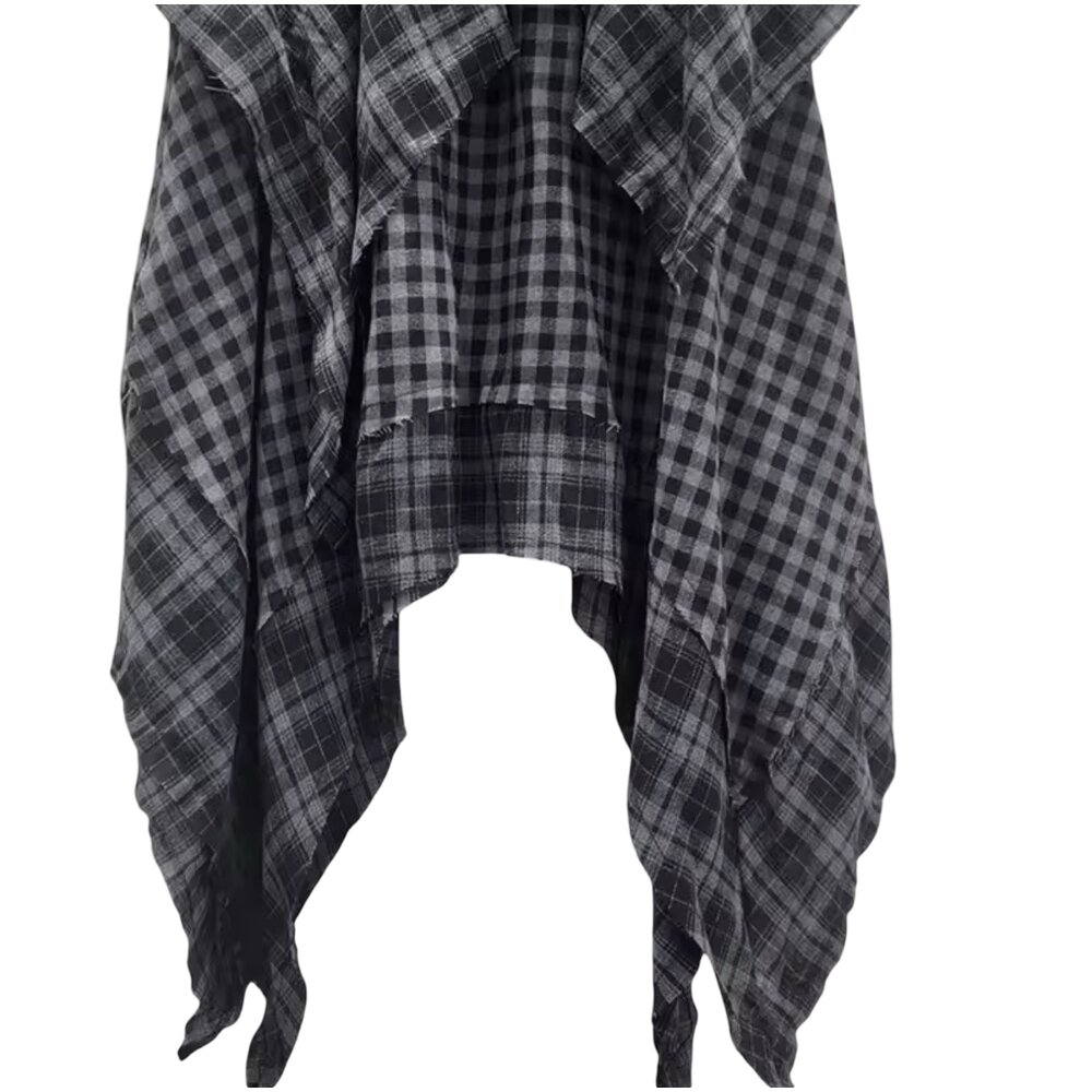 An expressive fusion of movement, texture, and reclaimed tradition, the Nomad Plaid Deconstruction Skirt is a statement piece rooted in artisanal layering and avant-garde design. Crafted from mixed plaid and gingham textiles, this skirt reimagines classic patterns through an intentionally irregular, free-flowing silhouette.