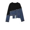 The defining feature is the diagonal deconstructed denim overlay that slices across the midsection and sleeves in an asymmetrical sweep. Crafted from durable mid-wash indigo denim, these panels introduce rugged texture and dimensional depth to the otherwise refined knit. Raw-edge frayed seams intentionally expose loose threads, celebrating authenticity and the beauty of unfinished craftsmanship. The interplay between the matte knit and the structured denim produces a visually striking tension—soft against rigid, polished against distressed.