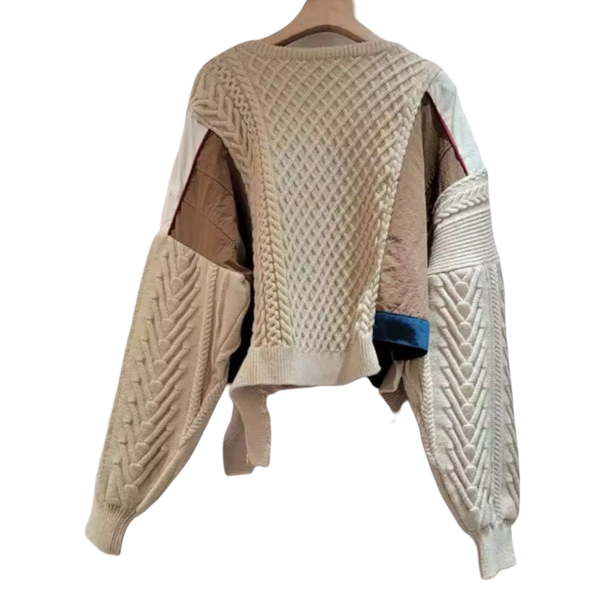 At its core, the sweater features a luxuriously textured cable-knit body in a soft, bone-neutral tone, showcasing multiple knit patterns layered across the front, back, and sleeves. Intricate braided cables, ribbed panels, and diamond-stitch motifs work together to create depth, tactility, and visual rhythm—each stitch acting as a quiet nod to old-world craftsmanship.
