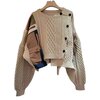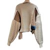 button-accented shoulder placket enhances the architectural feel of the piece, allowing the garment to drape and fold organically on the body. The cropped, uneven hemline reinforces its sculptural nature, ensuring no two angles appear the same when worn. From the back, the sweater reveals a striking continuation of the cable-knit patterning, reinforcing its all-around craftsmanship and gallery-worthy construction.