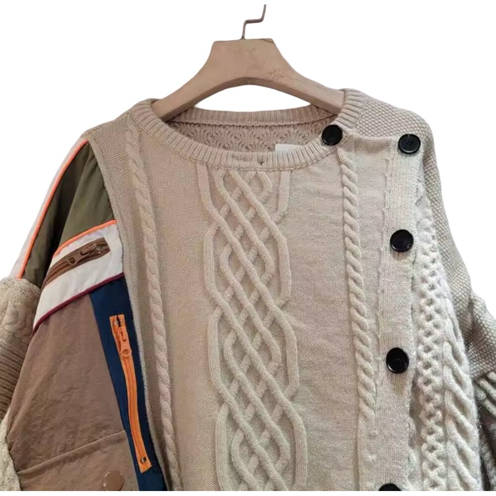 The “Pale Relic Asymmetry” Hybrid Sweater is a masterfully deconstructed statement piece that blurs the boundary between heritage knitwear and modern utilitarian design. Crafted as a one-of-a-kind wearable artifact, this garment fuses classical cable-knit traditions with technical textile elements, creating a silhouette that feels both ancient and future-leaning.