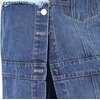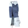 Crafted from dual-tone premium denim, the garment juxtaposes a deep indigo wash with an icy pale blue counterpart, creating a striking visual dialogue that evokes light meeting shadow. The upper collar-style waistband introduces an unexpected tailored element, lending the piece a refined edge while anchoring its otherwise avant-garde construction. Clean metallic snap closures run vertically along the front, offering both functional adjustability and a sleek industrial accent that complements the rugged denim textures.