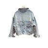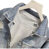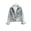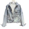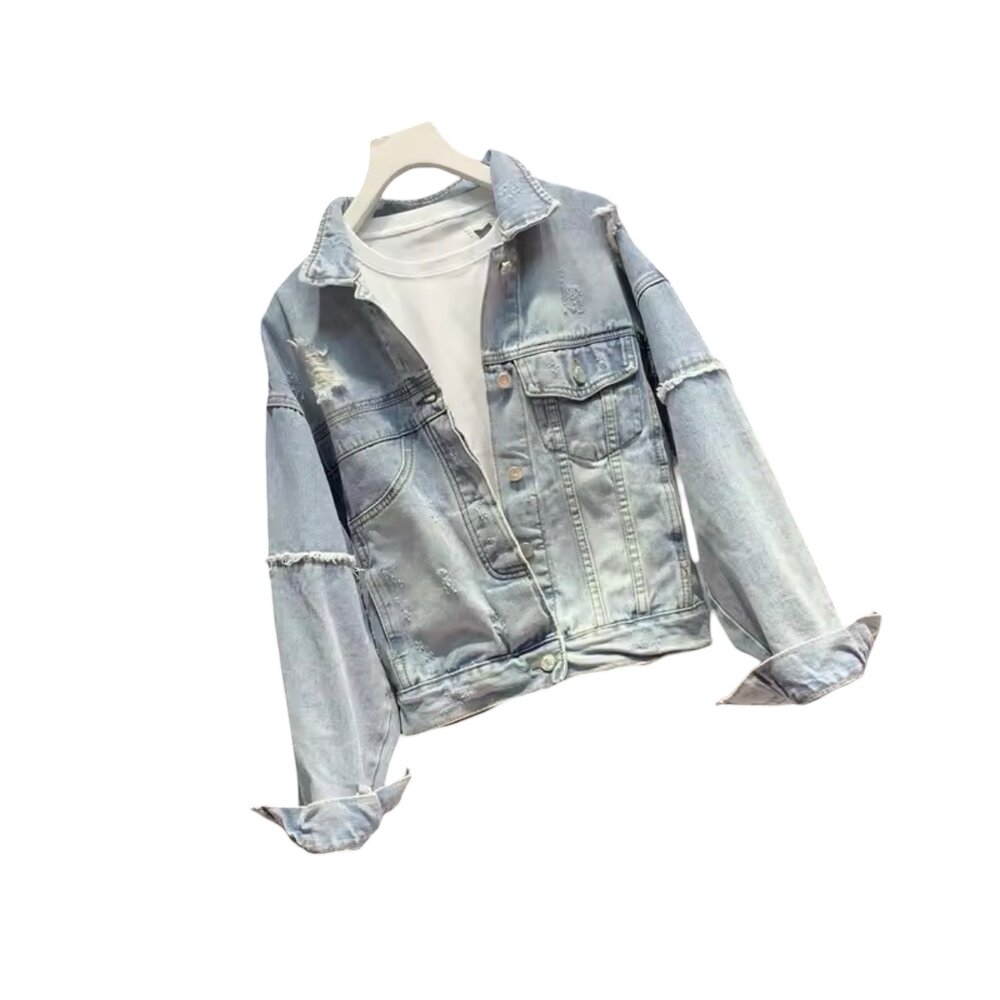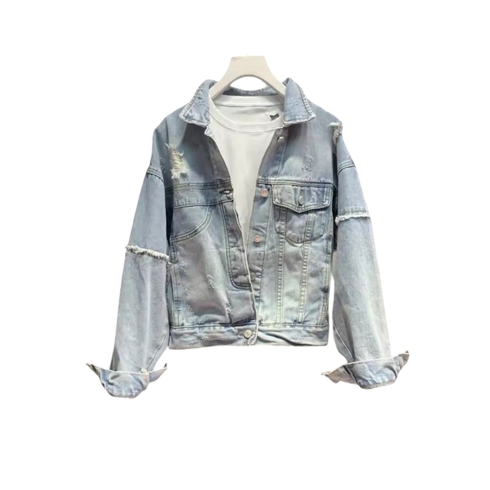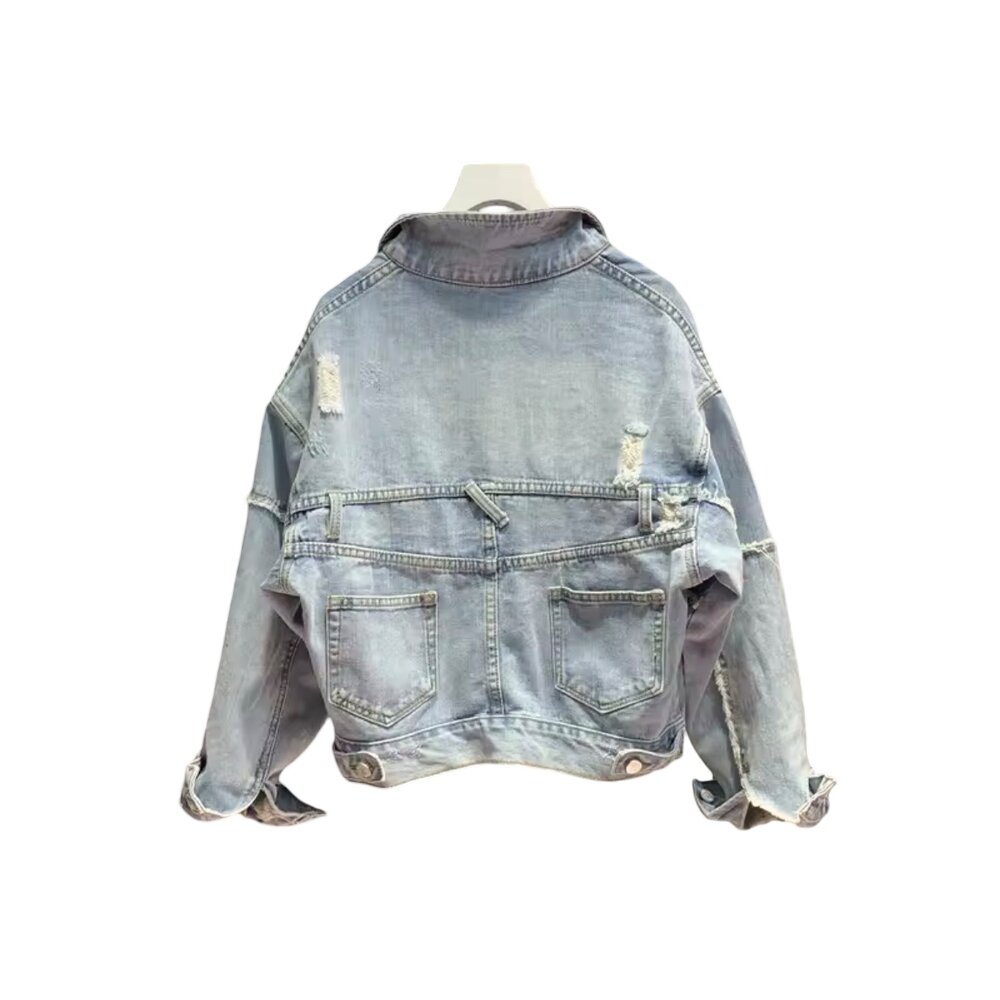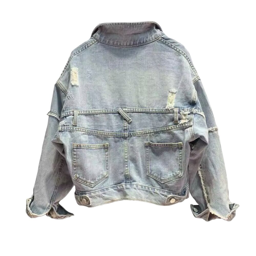 The outer jacket features a soft, light-washed denim construction with a naturally faded vintage tone that evokes authentic lived-in character. Its cropped silhouette offers a flattering, fashion-centric profile that pairs seamlessly with high-waisted jeans, skirts, joggers, or layered dresses. Thoughtfully placed distressed accents across the shoulders, sleeves, and body provide texture and visual interest without overwhelming the design, creating a balanced blend of rugged charm and refined minimalism.