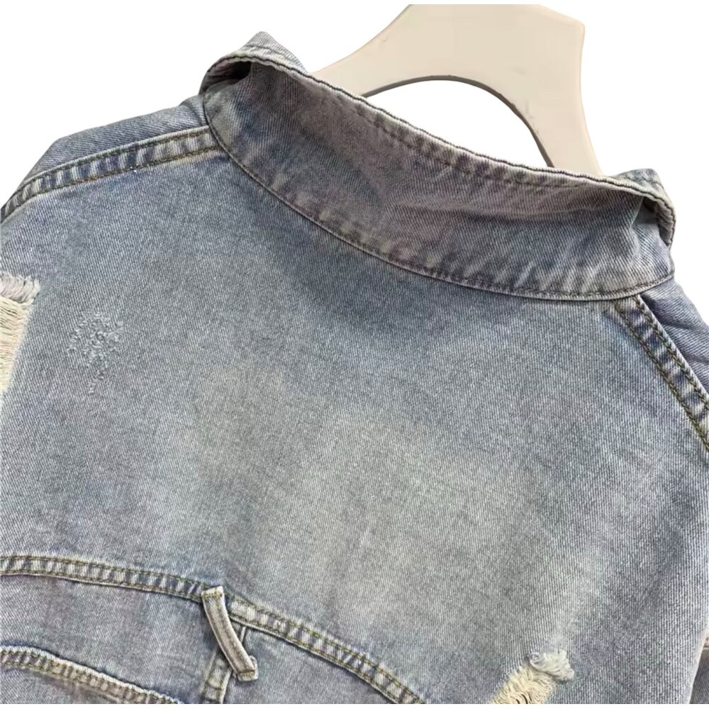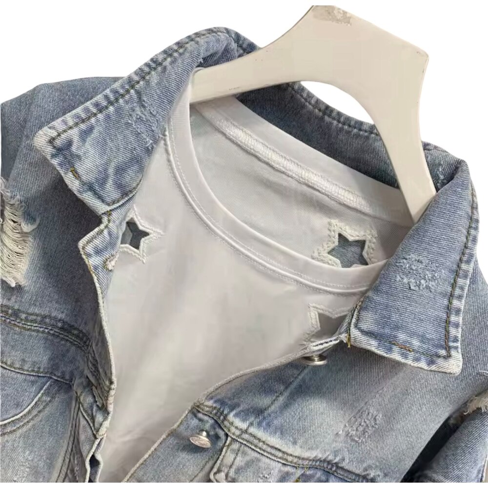 Key Features: • Cropped light-wash denim jacket with vintage fade effect • Soft integrated white tee with star cut-out neckline accents • Distressed detailing across sleeves, shoulders, and back • Relaxed oversized sleeves with rolled cuffs • Classic collar with front button closure • Dual back patch pockets for balanced utility styling • Adjustable hem tabs for customizable fit • Lightweight yet durable denim blend for year-round wear • Effortless layered look — no extra styling required