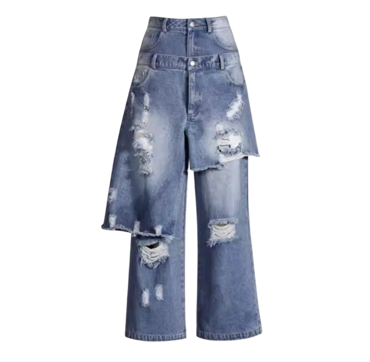 • 2.  Women's Deconstructed Nomad Drop-Crotch Denim Trousers with Leather Cargo Paneling