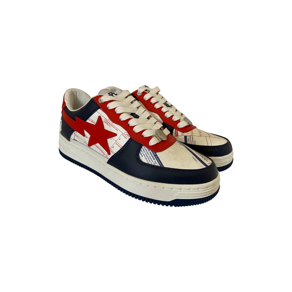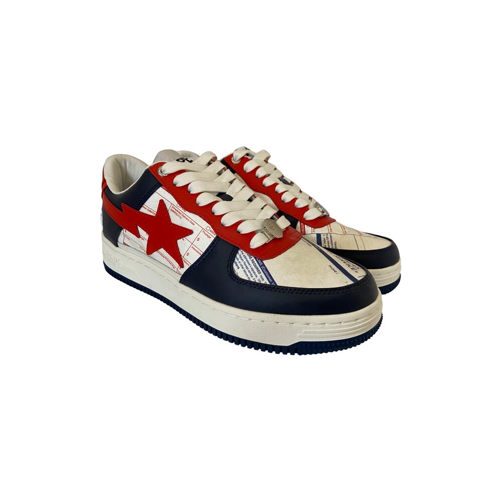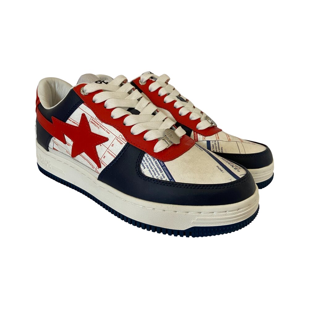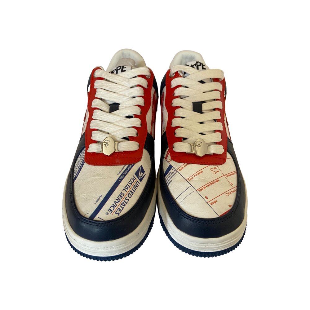 The sneaker features a white base with print mimicking the look of USPS Priority Mail forms along with a texture matching an envelope thanks in part to the help from DuPont. Blue overlays appear on the upper while red accents appear on the Star logo and eyelets. The classic USPS logo appears on the lateral side of the left shoe while the iconic APE face logo appears on the lateral side of the right shoe. Matching APE face dubraes appear on the laces to complete the look.