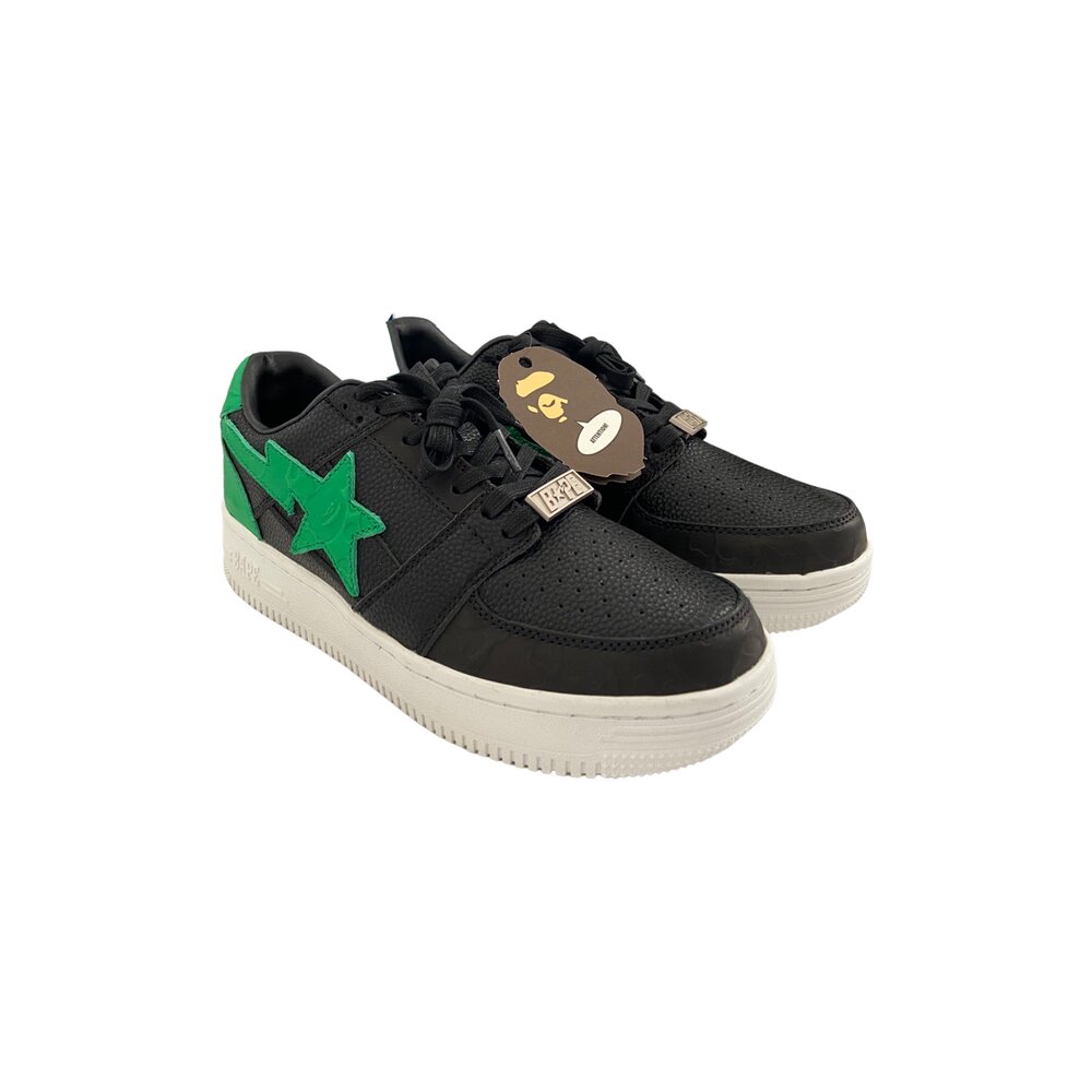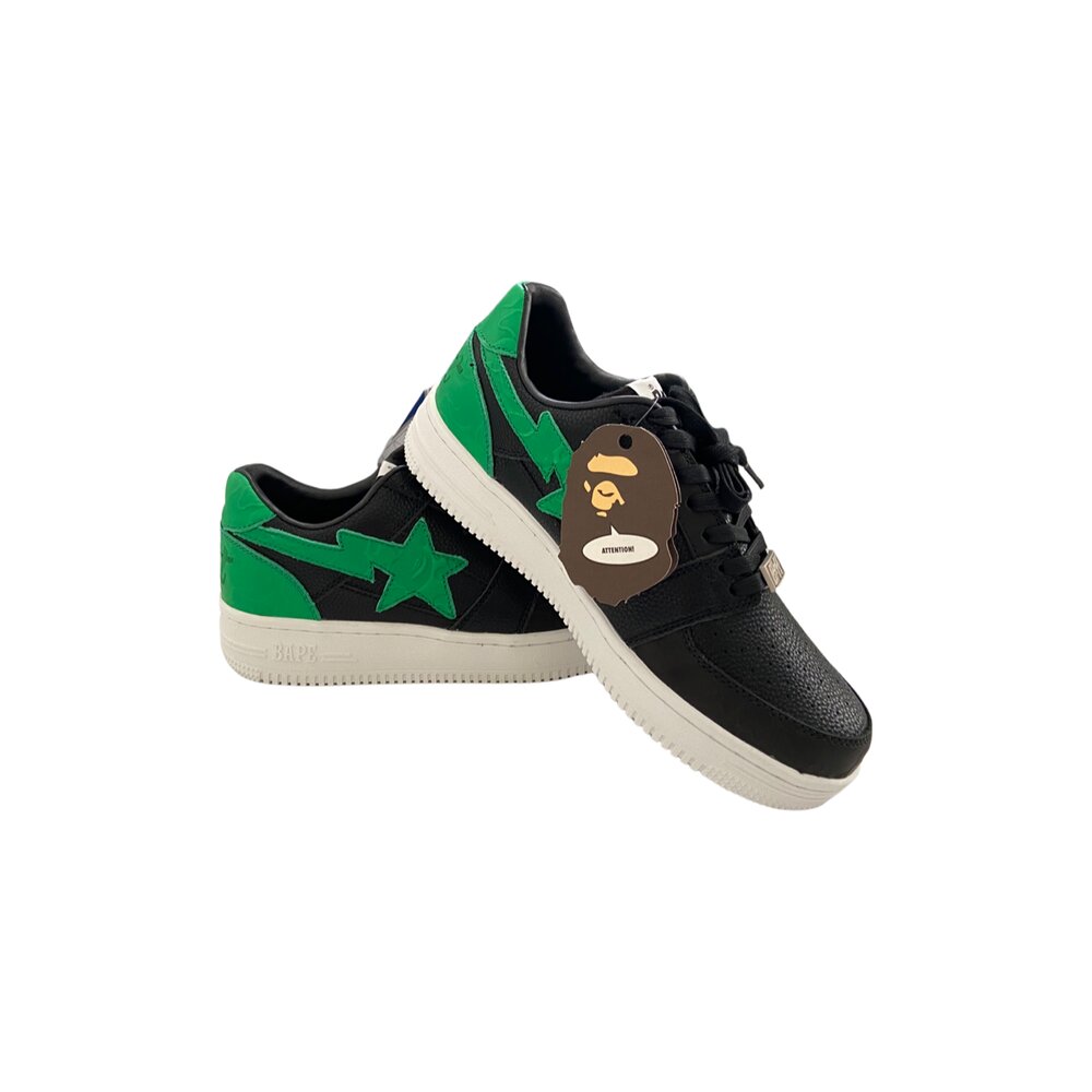 The BAPE® x GUNNA BAPESTA™ is designed in patent leather with black/green coloring and the “GUNNA” logo placed on the label and the “SLATT” logo subtly placed on the heel of the BAPE STA™.