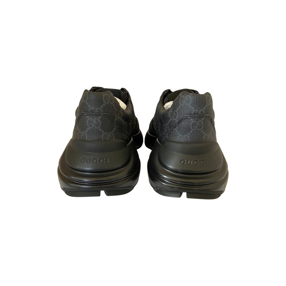 Reimagining the material's historic origins, GG Supreme is presented in black as part of Gucci Love Parade. The canvas has come to the front of each collection decade after decade to become a hallmark of the House. Here, the classic palette defines this pair of Rhyton sneakers.